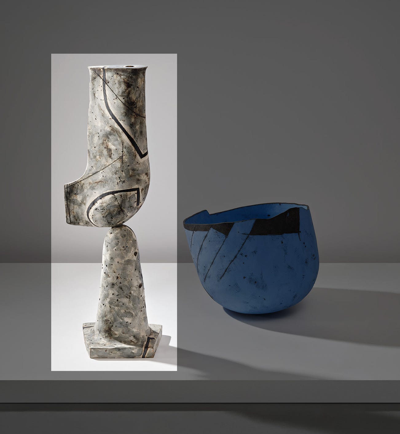 Earthenware, painted slips and glazes over incised and impressed markings to the surface inlaid with black, pewter enamel to the top.