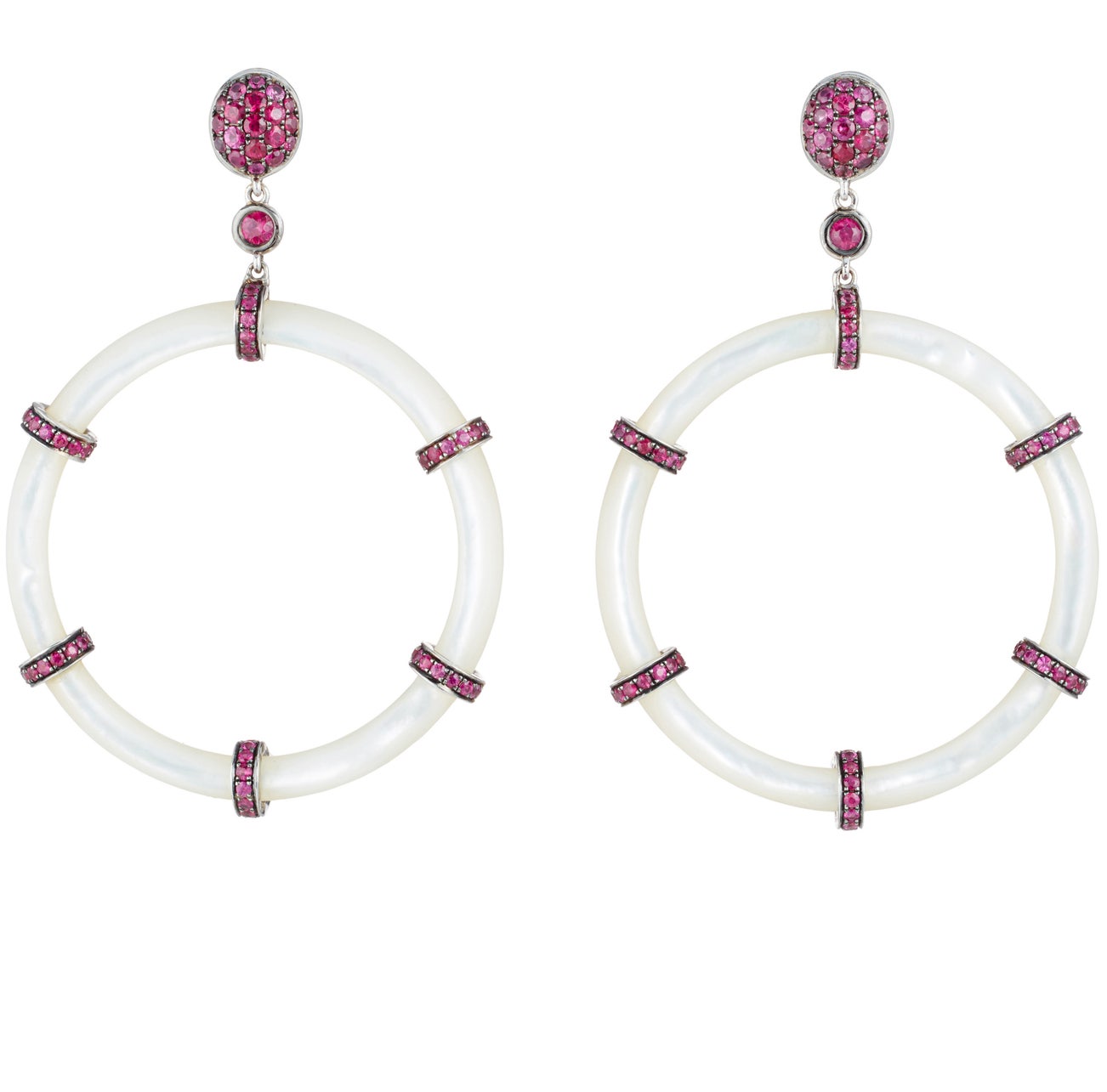 Carved mother-of-pearl hoops and round rubies