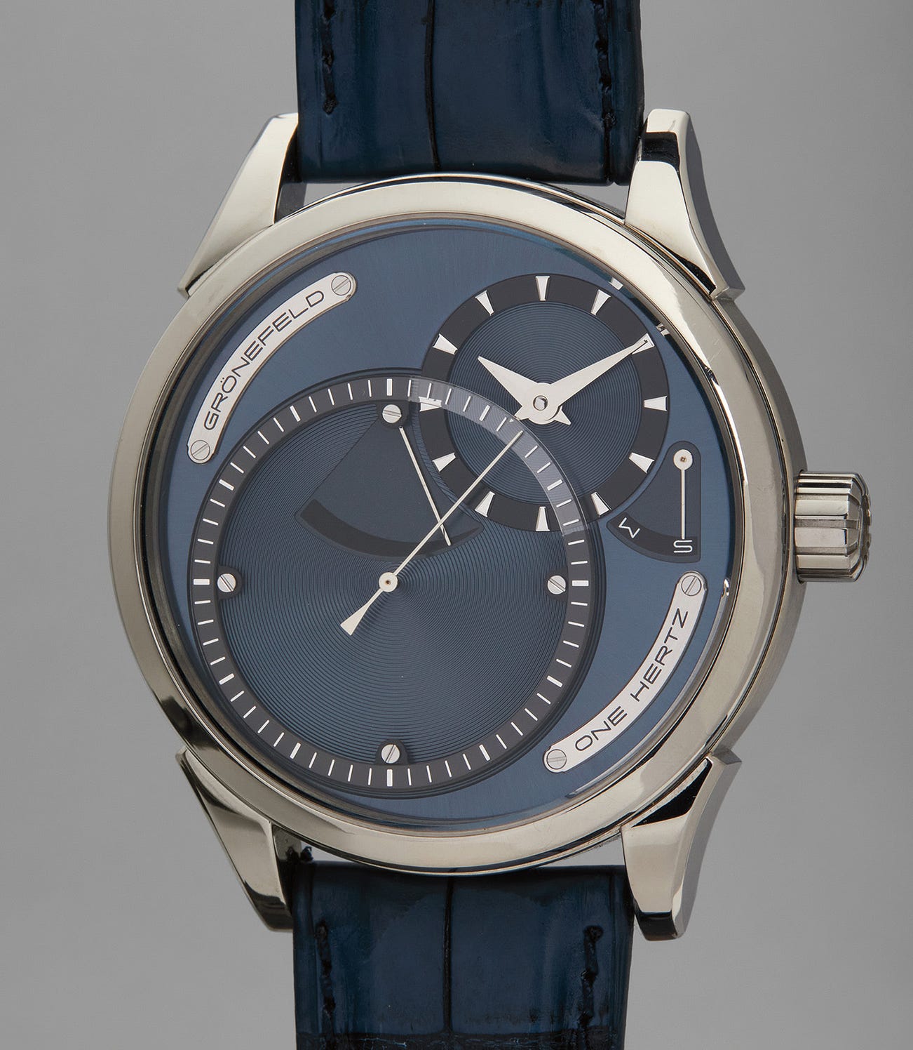 The Hertz One wristwatch was released in 2010 as the world’s first serially produced watch made with independent deadbeat seconds. While the complication is not unique in horology, it was Gronefeld’s secondary gear train powering the deadbeat seconds that added a novel ideal to modern horology. This dedicated gear train permits seconds to be driven from one independent mainspring barrel, while the hours and minutes are driven from a second mainspring. The dial’s unique design expressed the importance of this complication with its prominent display of the seconds comprising the majority of the dial, while the time, indicated in a small sub-dial at 2 o’clock, is relegated to a smaller role. The completely in-house movement is of the highest quality, with exceptional hand finishing of its stainless steel bridges throughout, and the use of a free-sprung, variable inertia balance with Phillips overcoil. One of only 30 limited edition examples produced in titanium, the present lot was the first of the series with serial number 1.