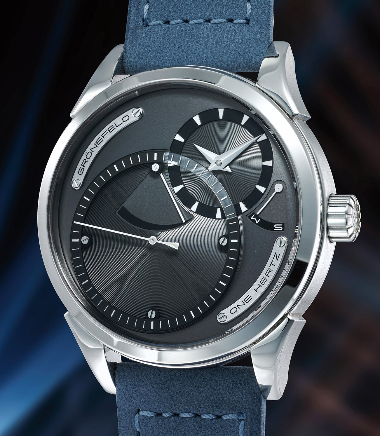 The One Hertz was released in 2010 as the world’s first serially produced watch made with independent deadbeat seconds. While the complication is not unique in horology, it was Grönefeld’s secondary gear train powering the deadbeat seconds that added a novel ideal to modern horology. This dedicated gear train permits seconds to be driven from one independent mainspring barrel, while the hours and minutes are driven from a second mainspring.