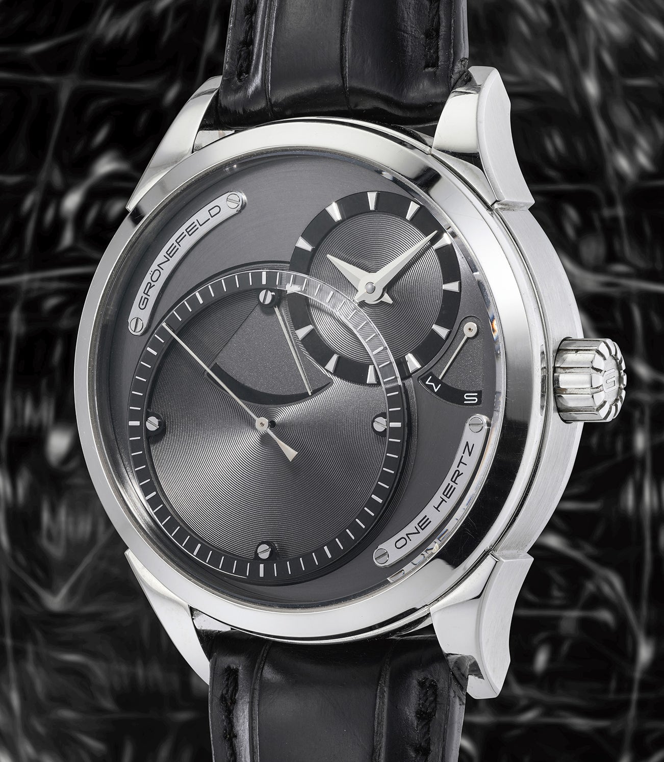 Accompanied by Grönefeld Certificate of Authenticity, polishing cloth, Grönefeld service invoice dated July 2022, additional alligator strap, fitted presentation box and outer packaging.