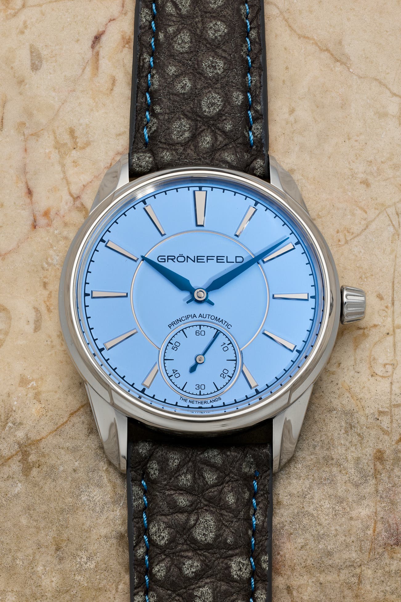• The beautiful light cornflower blue dial, with a gloss effect, is complemented by a grey buffalo leather strap with matching light blue contrast stitching. Along with the elegant flame-blued lancette hour and minute hands and faceted hour markers, the stainless steel case exudes charm and comfort in equal measure.