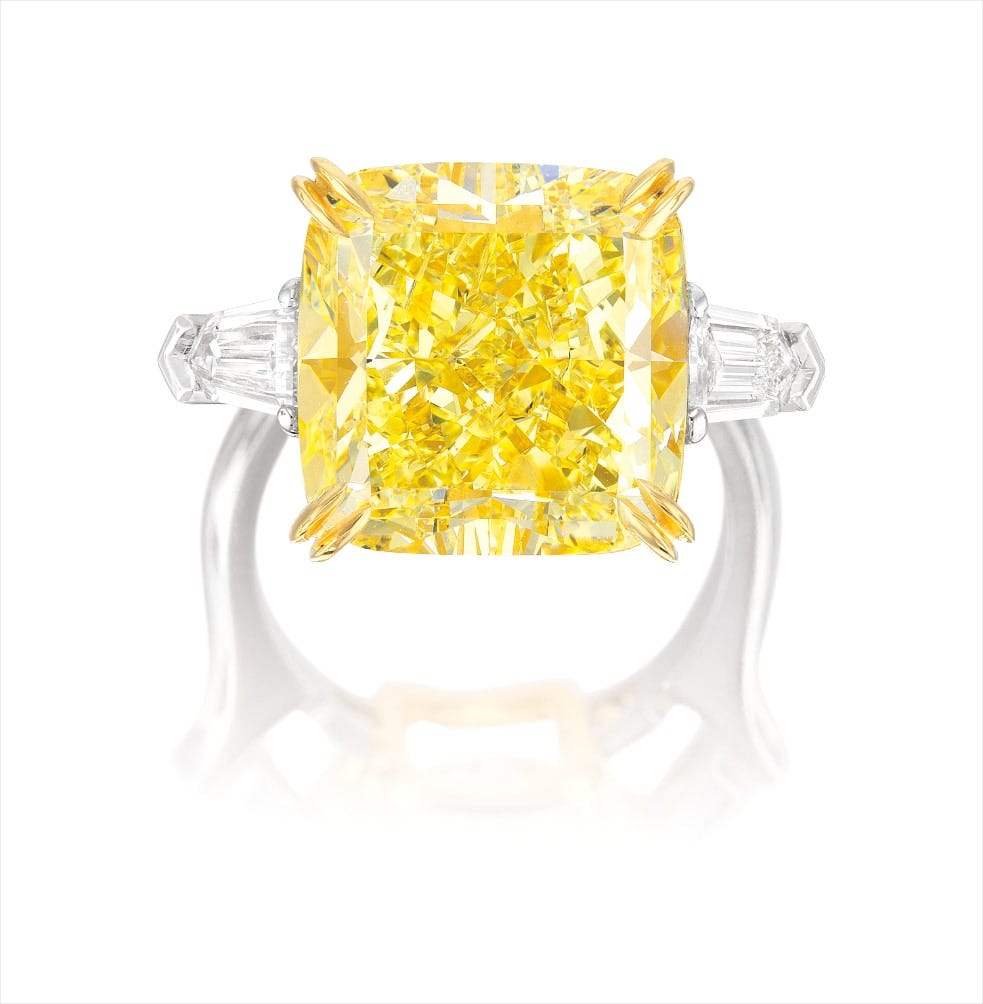 One cushion modified brilliant-cut Fancy Yellow diamond, 12.03 caratsTwo shield-shaped diamonds on sidePlatinum and 18 karat yellow gold(12.03-carat Diamond)