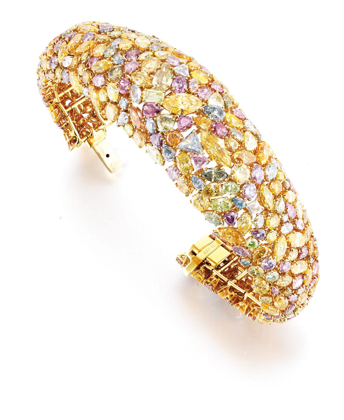 Laurence Graff, the founder of Graff Diamonds, was one of the first to position high jewellery as a retail business and developed this into a vertically integrated empire with an esteemed reputation for offering the best diamonds in the world. With stakes in Safdico and Letseng, and a diamond technology park in Botswana, Graff has access diamond rough of the finest quality first-hand, which their specialist diamond cutters fashion to precise specifications. This very bracelet gathers an exemplary collection of these alluring coloured diamonds, many of which display an attractive colour intensity that is highly covetable.