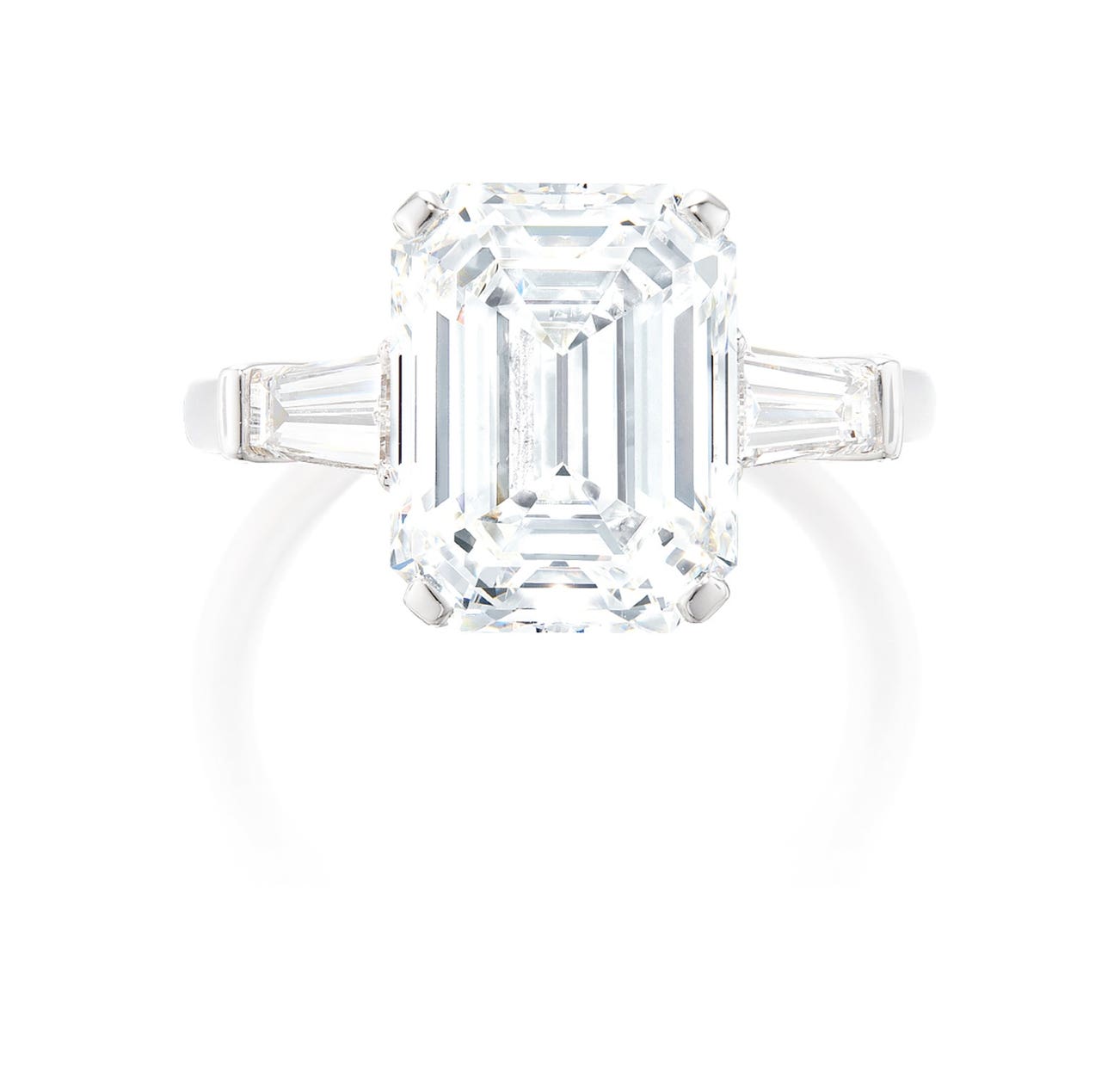 An emerald-cut diamond, 6.18 caratsFlanked by two tapered baguette-cut diamondsPlatinum<em>With signed box</em>(6.18-carat Diamond)