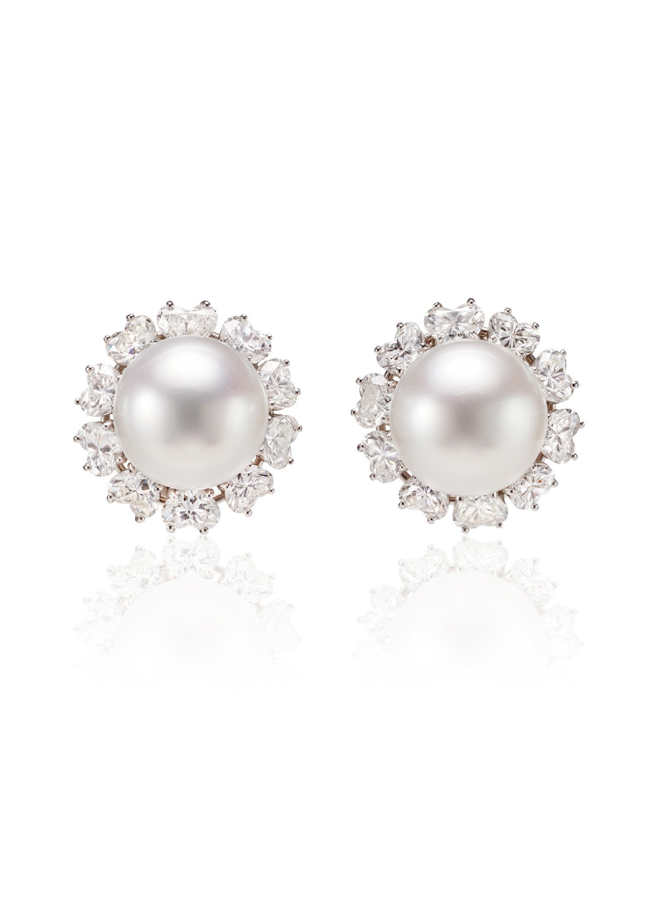 A Pair of South Sea Cultured Pearl, Diamond and Gold Earrings