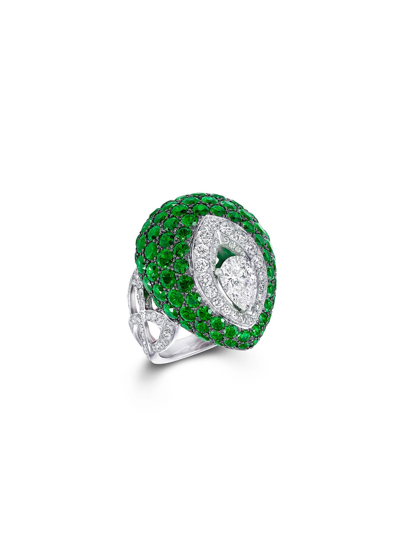 An Emerald, Diamond and Gold ‘Pavilion’ Ring