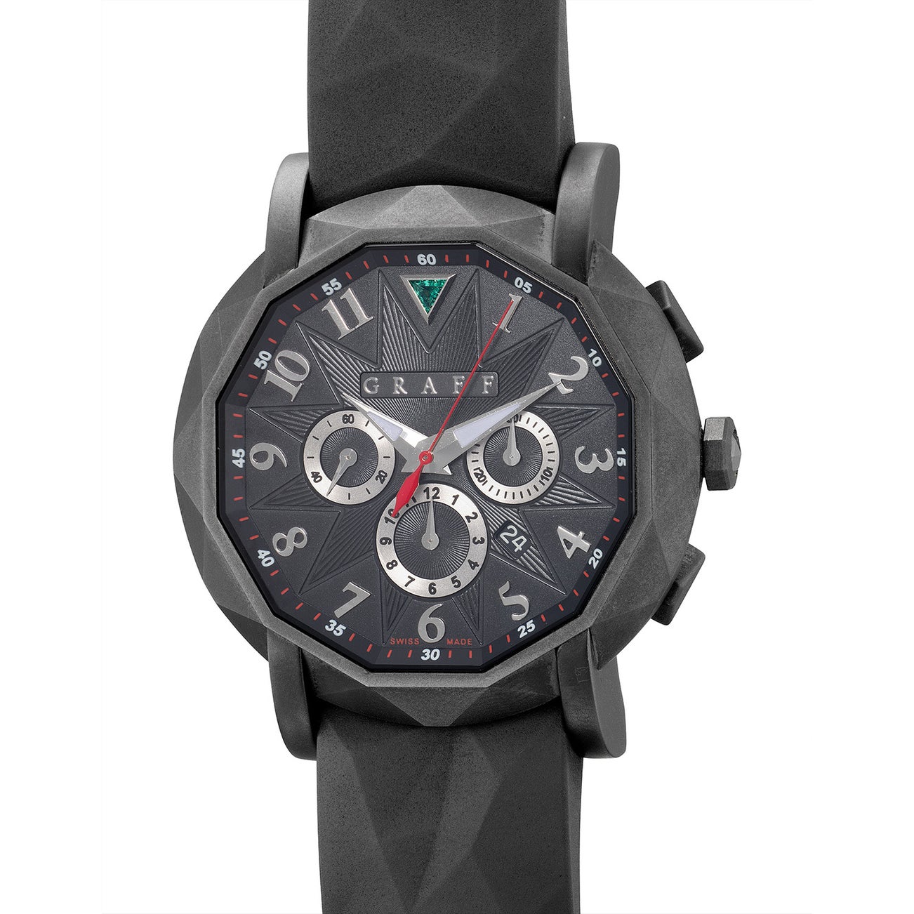 Since 1960, Graff’s heritage for luxury craftmanship and expertise in diamonds have been known to many. Boasting with technical prowess and contemporary vision on exquisite timepieces, the present ChronoGraff in an all-black DLC-coated stainless steel appearance is sophisticated yet playful. Cased in a modest sized 42mm diamond-like faceted case, the timepiece features a sun ray guilloché finished dial with an energetic dash of red accents. Furthermore, the 12 o’clock marker is adorned by a pop of color with an triangular emerald-set index. With a contemporary vision, the DNA of the case is furthermore expressed coherently onto the faceted rubber strap. Numbered 80 out of a limited edition of 500 pieces, the present example offered by its original owner is in excellent overall condition and accompanied by its accessories.