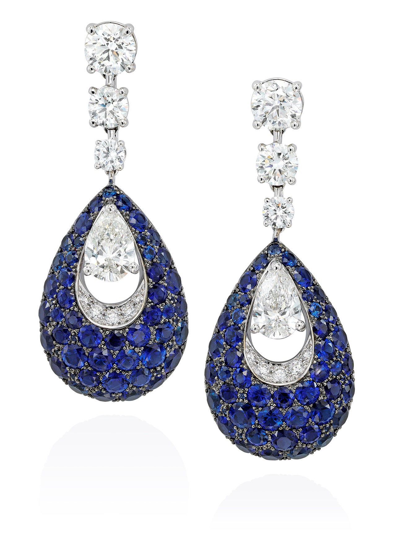 Each set with a pear-shaped diamond, accented by circular-cut sapphires and brilliant-cut diamonds, surmounted by graduated brilliant-cut diamonds ending in a round brilliant-cut diamond weighing 0.70 carat, mounted in white and blackened gold, posts with push backs, each signed Graff, numbered, stamped.