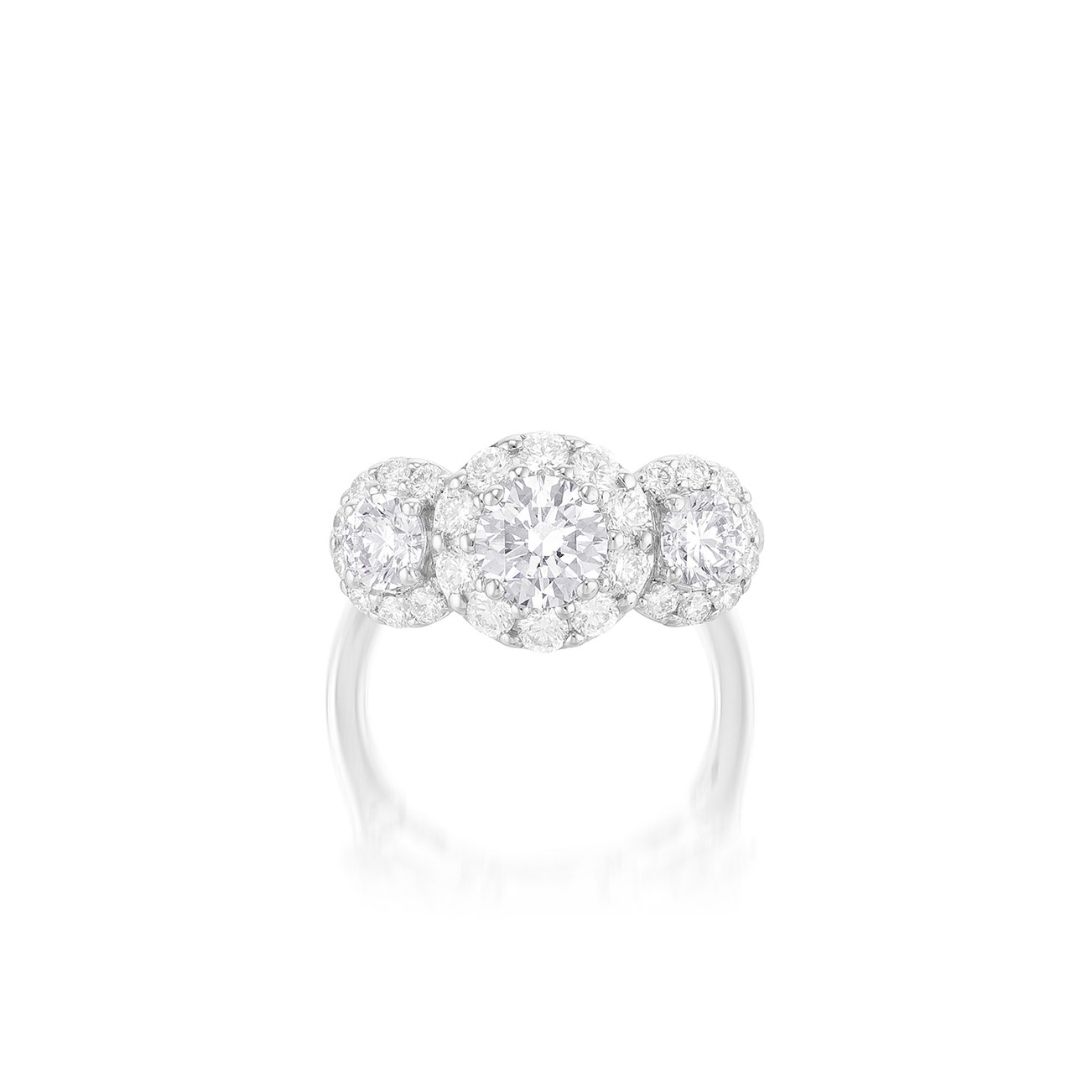 Set with three brilliant-cut diamonds, each within a surround of smaller brilliant-cut diamonds, mounted in white gold, signed Graff, numbered, size 2¾, case stamped Graff.