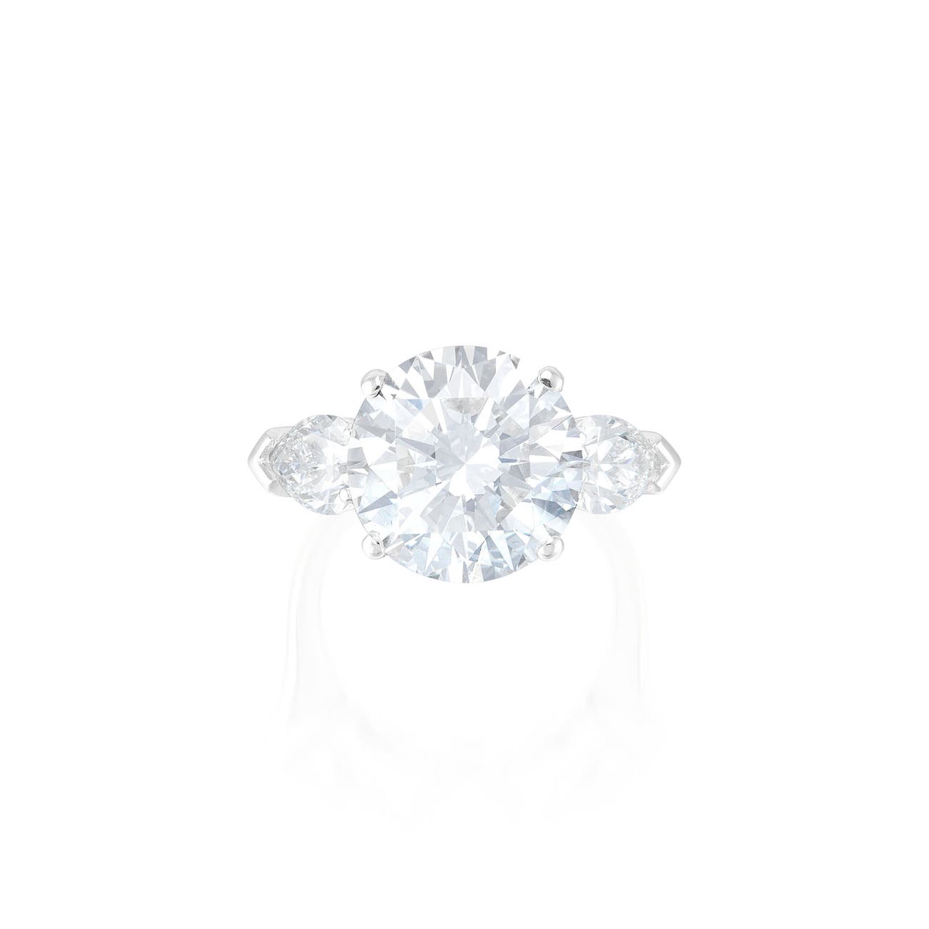 Set with a brilliant-cut diamond weighing 5.02 carats, flanked by two pear-shaped diamonds, mounted in platinum, signed Graff, size 3½, case stamped Graff.