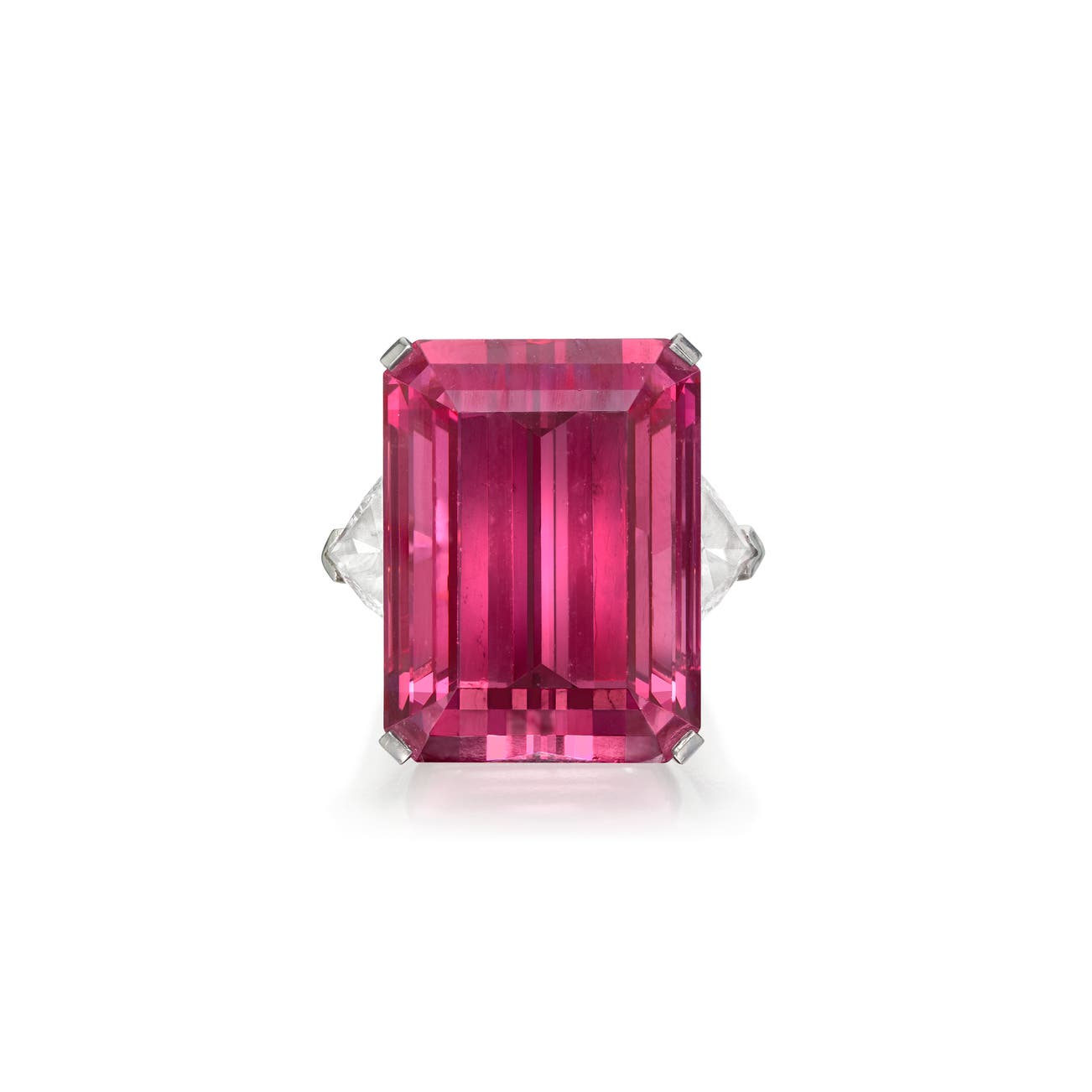 Centering a step-cut pink tourmaline weighing approximately 58.73 carats, accented with triangular diamonds, mounted in platinum, size 5 3/4, signed Graff.