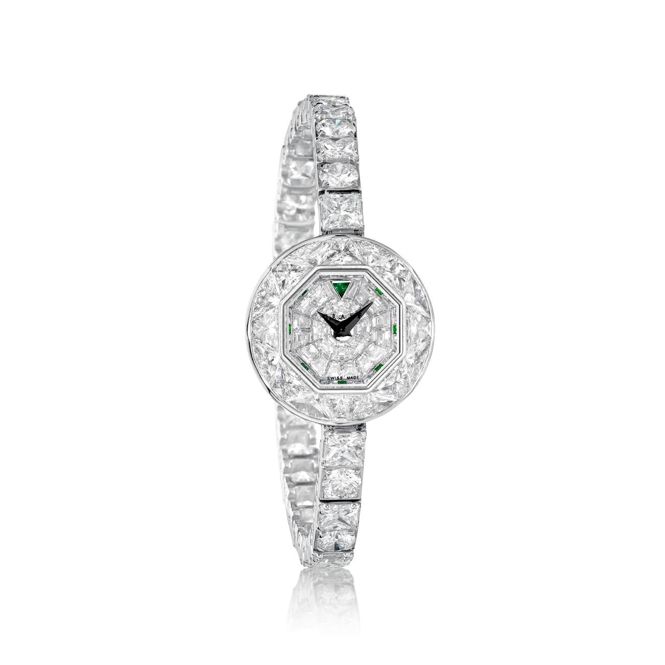 Set with brilliant-, princess-, square-, triangular, baguette and fancy-cut diamonds, the dial accented with square and triangular emeralds, with quartz movement, mounted in 18k white gold, inner circumference measuring approximately 6 1/4 inches, signed GRAFF, numbered. Produced in a limited series of 100 pieces.