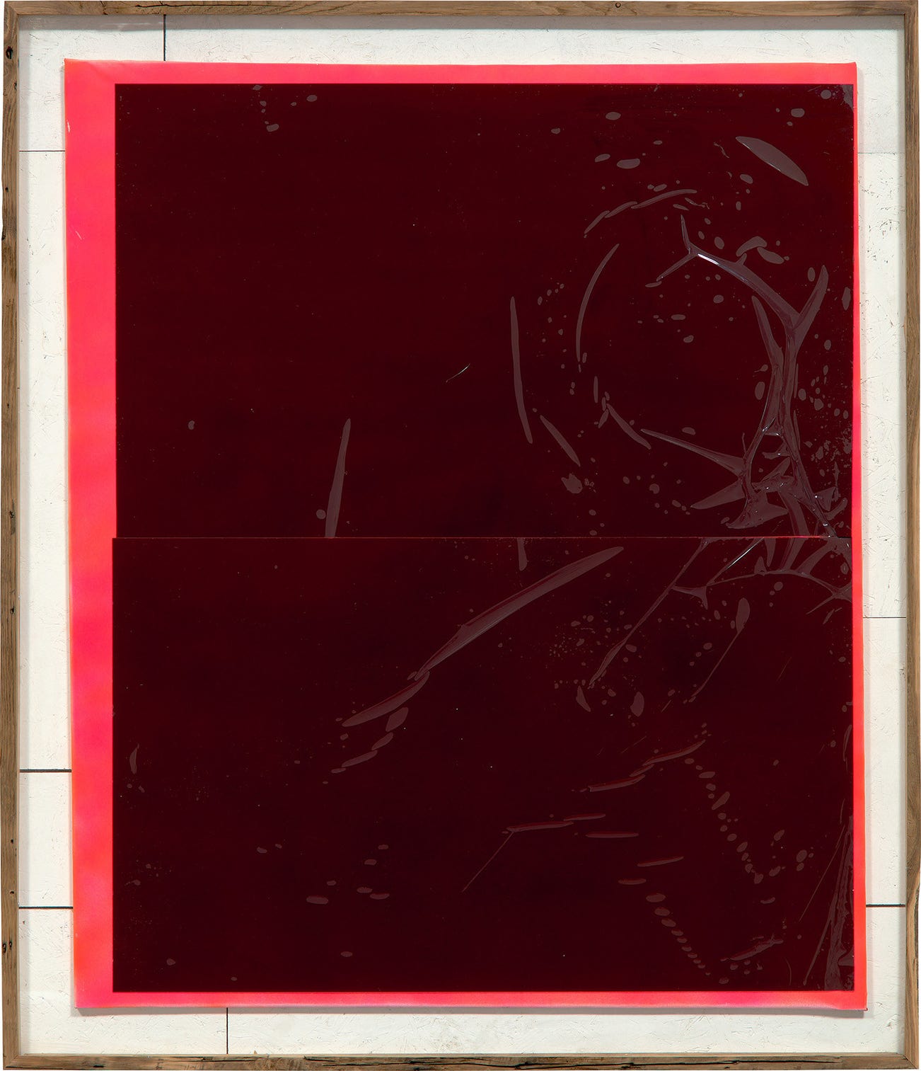 spray enamel on canvas, reclaimed wood and glass window tint, in artist's frame