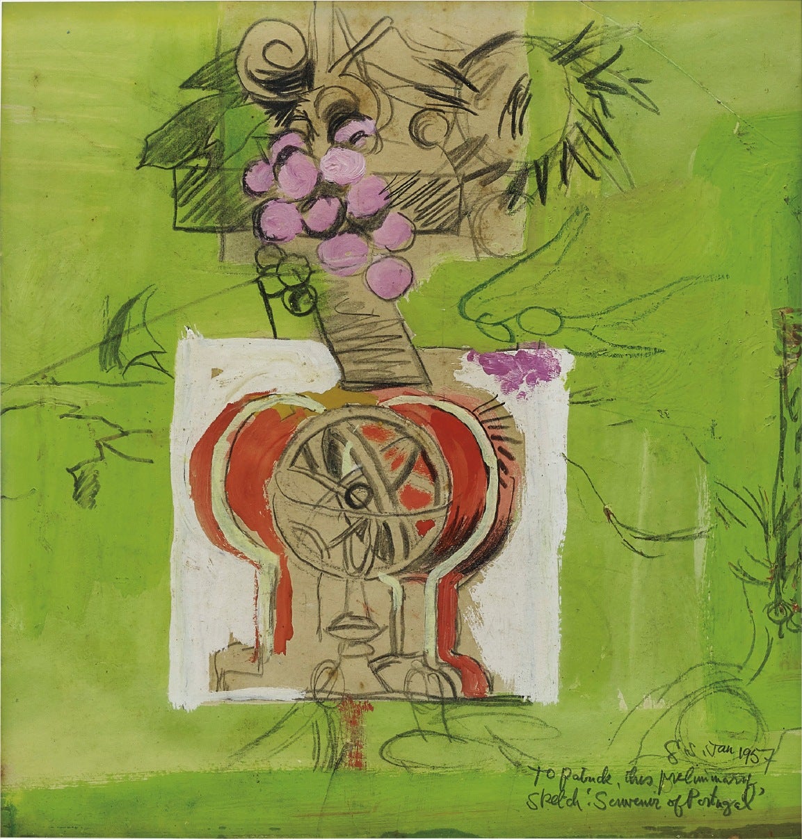 signed with the artist's initials, titled, dedicated and dated 'G. S. To Patrick, this preliminary sketch "Souvenir of Portugal" Jan 1957' lower right; further signed with the artist's initials, titled, inscribed and dated 'Preliminary Sketch "Portugal No. II" G. S. 1957' on the reverse