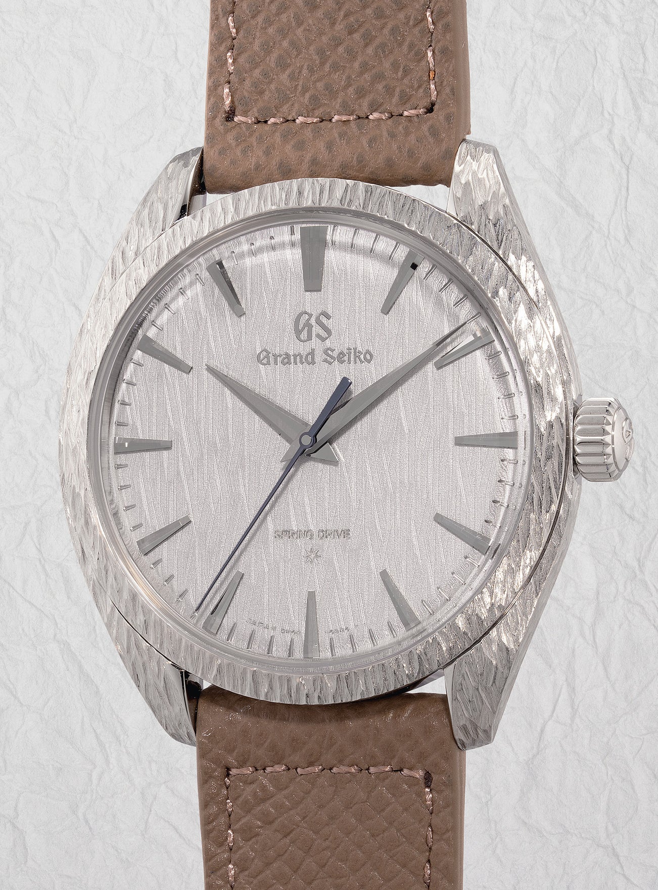 The platinum case is first polished to a mirror finish before being meticulously engraved by the skilled artisans at the Shinshu Watch Studio. The new textured metallic-toned dial complements the engraved case, together evoking the serene beauty of nature. As each piece is hand-engraved, no two watches are alike, making each one uniquely special.