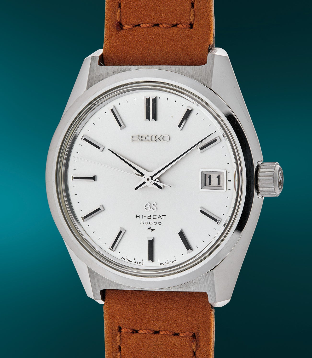The design of the Grand Seiko Style has carried through to the predecessor of the 44GS, the 45GS. Grand Seiko’s vintage line of 45GS watches were produced by the Daini Seikosha factory from approximately 1968 through the early 1970s. Offered with varying calibers including the time-only caliber 4520A, the caliber 4522A with date like the present lot, to the extraordinary time-only “V.F.A.” (Very Fine Adjusted) caliber 4580A, which at the time was one of the world’s most accurate mechanical wristwatch. The first two models were produced in stainless steel, steel with gold cap and rare examples in 18K yellow gold, while the “V.F.A.” model was only produced in hardened steel and stainless steel. It is interesting to note the Japanese Imperial household commissioned a series of Imperial “V.F.A.” ref. 4580-7020 timepieces, which were given as gifts to diplomats and visiting dignitaries. Never available publicly, they were a testament to the enduring craftsmanship of Grand Seiko wristwatches.