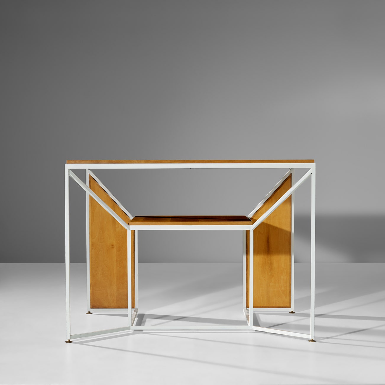 Jelutong-veneered wood, walnut, painted steel, brass.