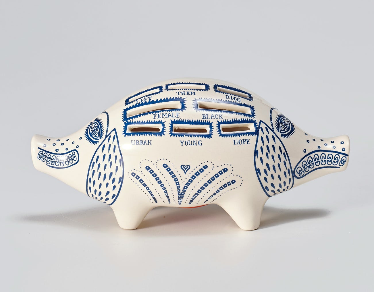 White ceramic piggy bank painted in blue and glazed, with rubber stopper, contained in the original cardboard box.