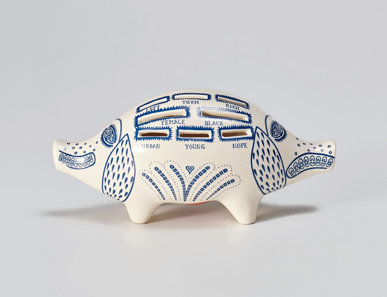 White ceramic piggy bank painted in blue and glazed, with rubber stopper, contained in the original cardboard box.