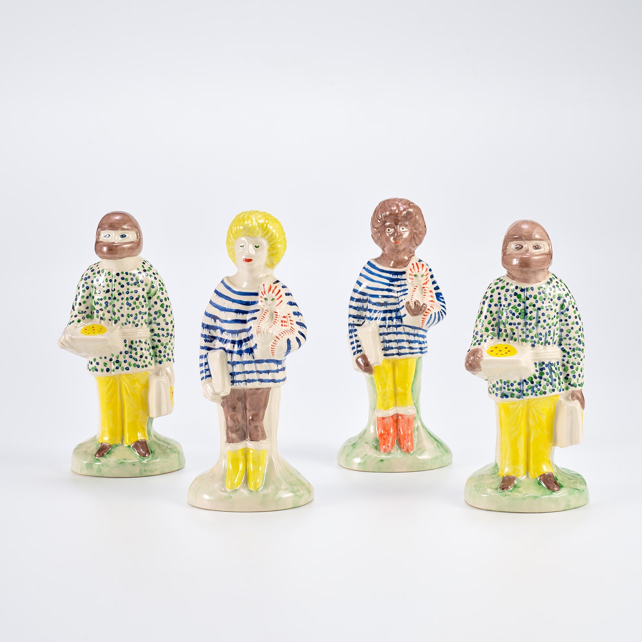 The complete set of four white earthenware ceramic figures painted in colours and glazed.