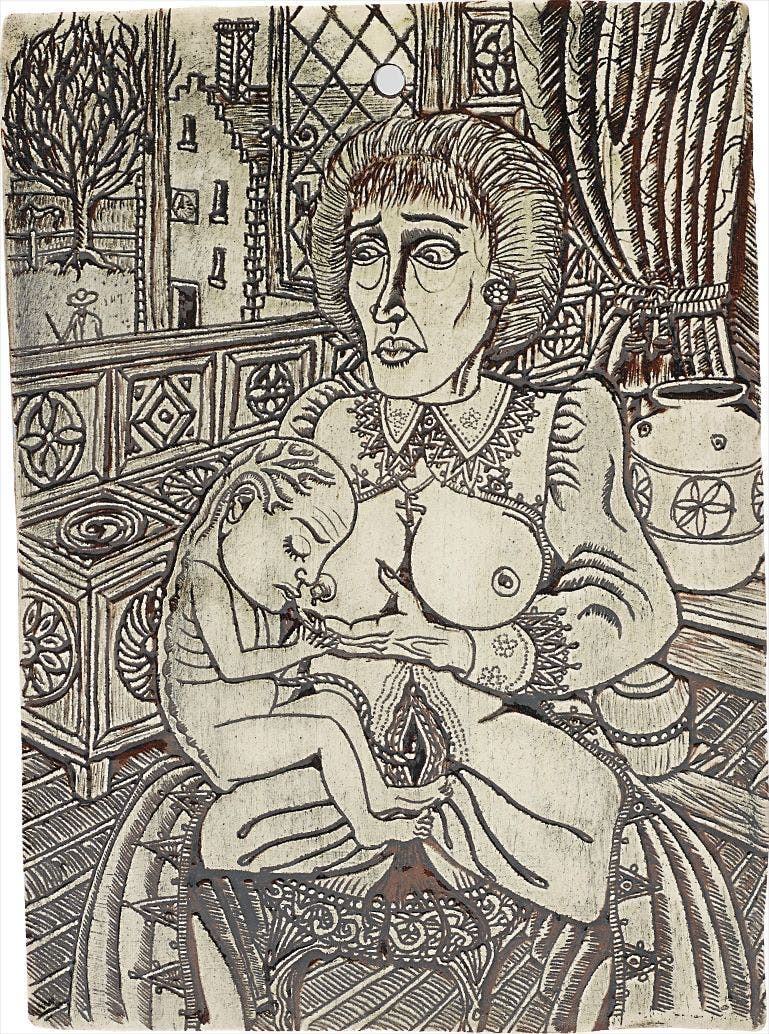 Unique earthenware tile painted in brown with knife engraving and glaze.