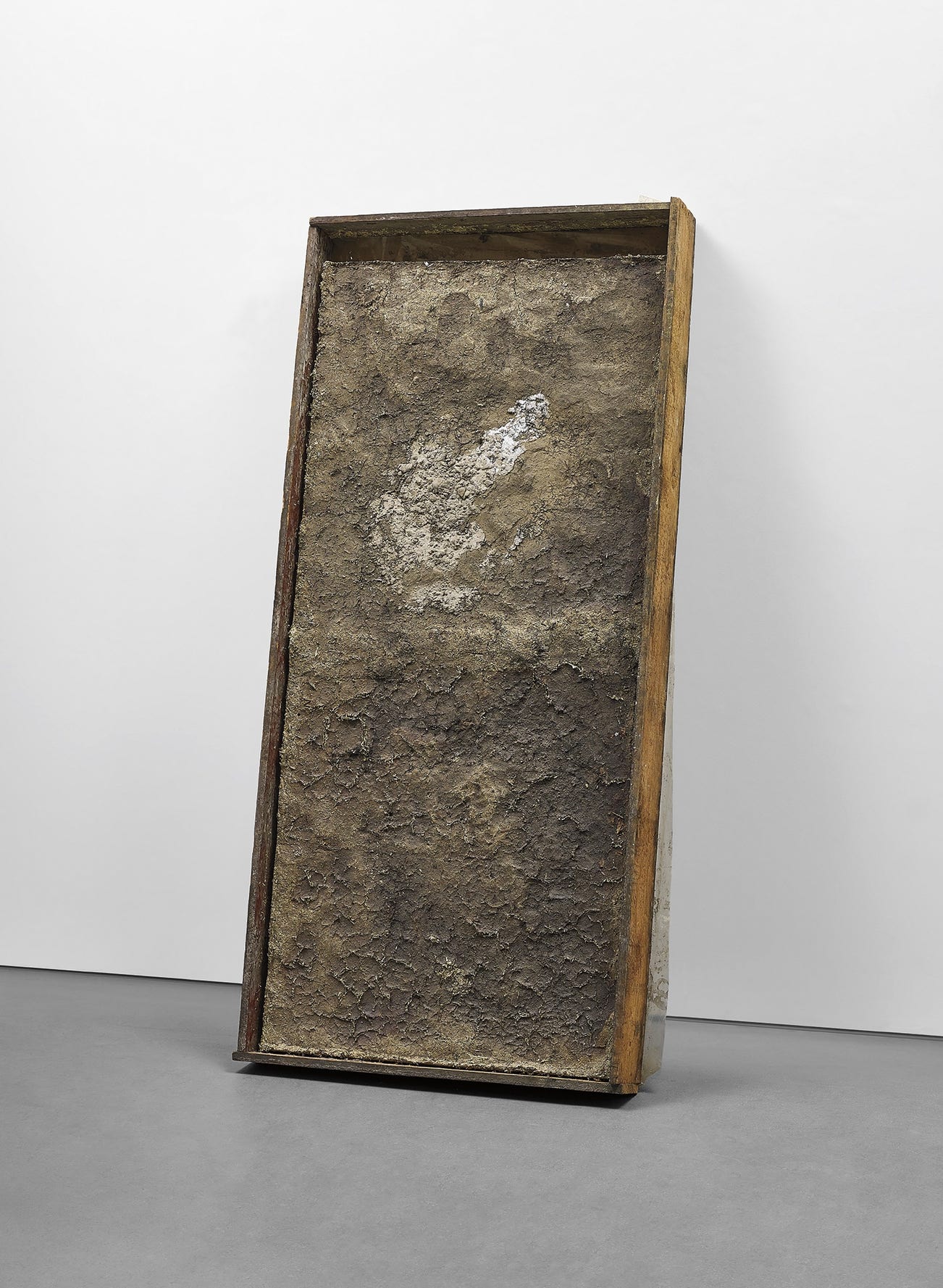 wood, plaster, paper, plastic and dirt, in artist's frame