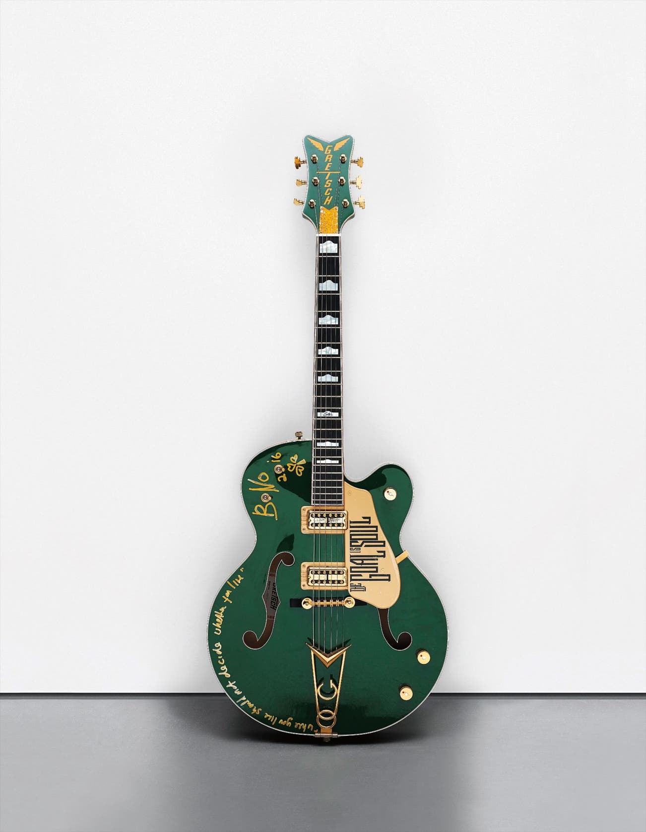 Produced by The Gretsch Company, Savannah, GA. Body signed with gold marker Bono 2016 and clover and inscribed "where you live should not decide whether you live." 12th fret signed Bono. Scratch plate inscribed THE GOAL IS SOUL. Interior paper label printed with model no. G61361 and serial no. JT05129386. Back of neck printed with serial no. and MADE IN JAPAN. Pickups stamped with patent numbers, tuning pegs marked GROVER. Together with the original case and manufacturer manuals, a Gretsch certificate of authenticity signed by Fred Gretsch and Bono, and a drawing by Bono with the note, I miss the IRISH FALCON so bad hold her tight for me Bono. Features Gretsch G-Cadillac tailpiece and Filter'Tron pickups. Custom "Evergreen" finish.