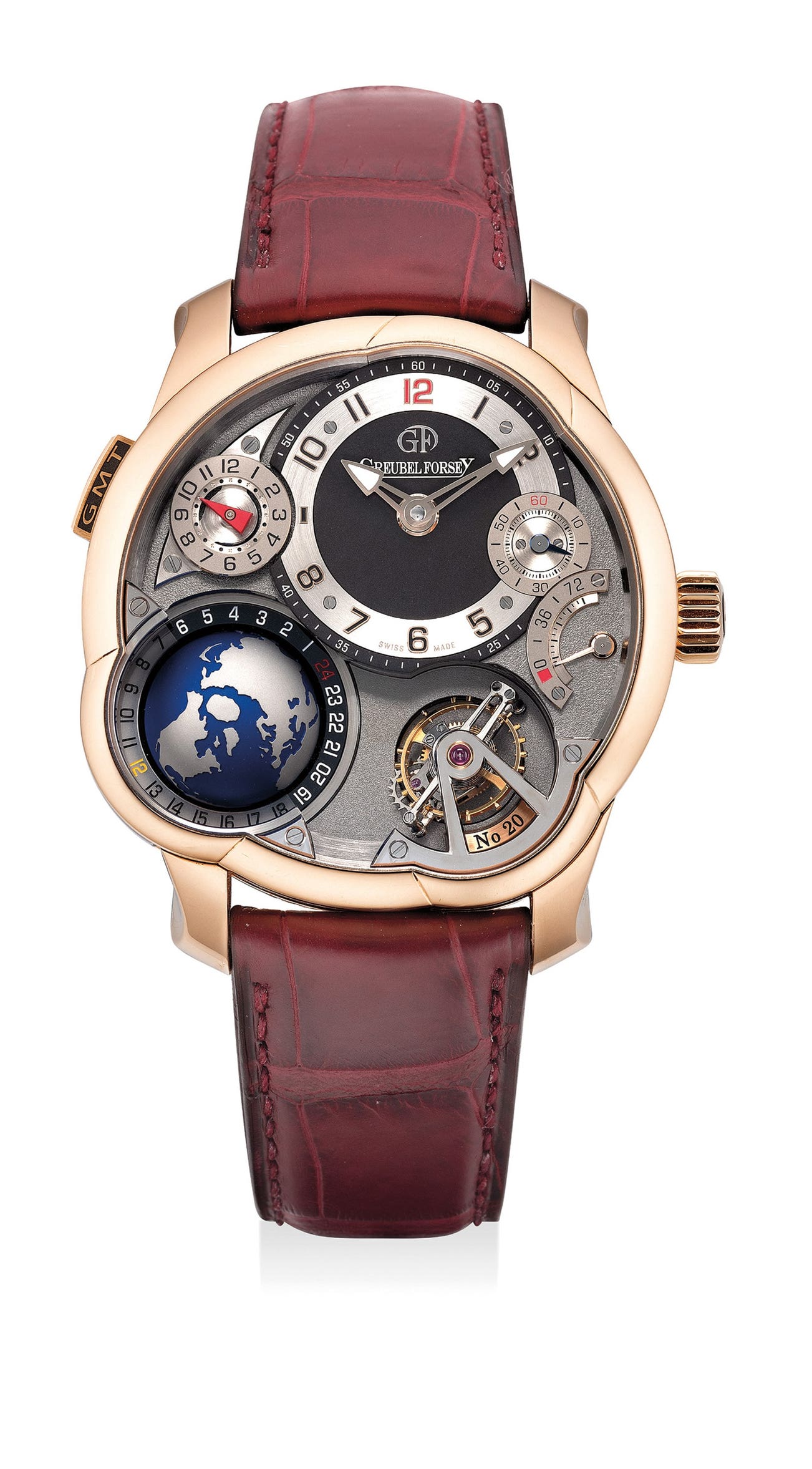 A superlative and unusual pink gold worldtime and dual-time wristwatch with power reserve indication, tourbillon regulator, warranty and box