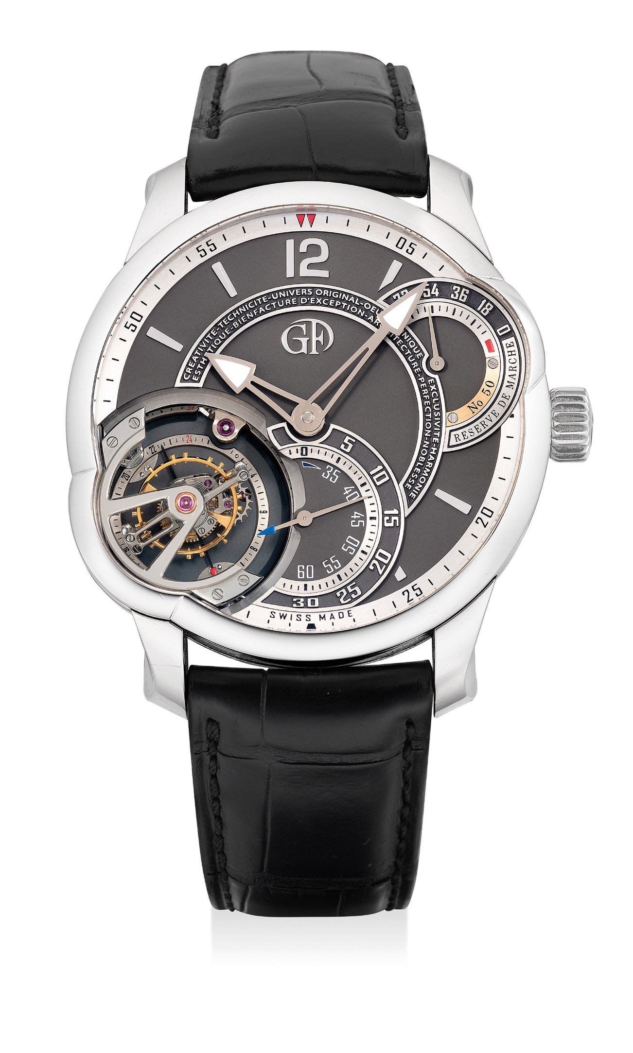 Swiss | 2004With the introduction of the Double Tourbillon 30 at Basel World in 2004, Robert Greubel and Stephen Forsey became major players in the world of haute horology and independent watchmaking. Their firm concentrates on high-end complicated movements with precision timekeeping and the highest quality hand finishing. They achieve this with movements featuring multiple tourbillons and inclined balance wheels — tourbillons designed for wristwatches. Forsey joined Greubel's team at Renaud & Papi SA, a high-complication specialist now part of Audemars Piguet. The team participated with Harry Winston and their Opus 6 project. In the span of 12 years, the firm has become highly sought-after by collectors for their innovative timekeeping and industrial design.