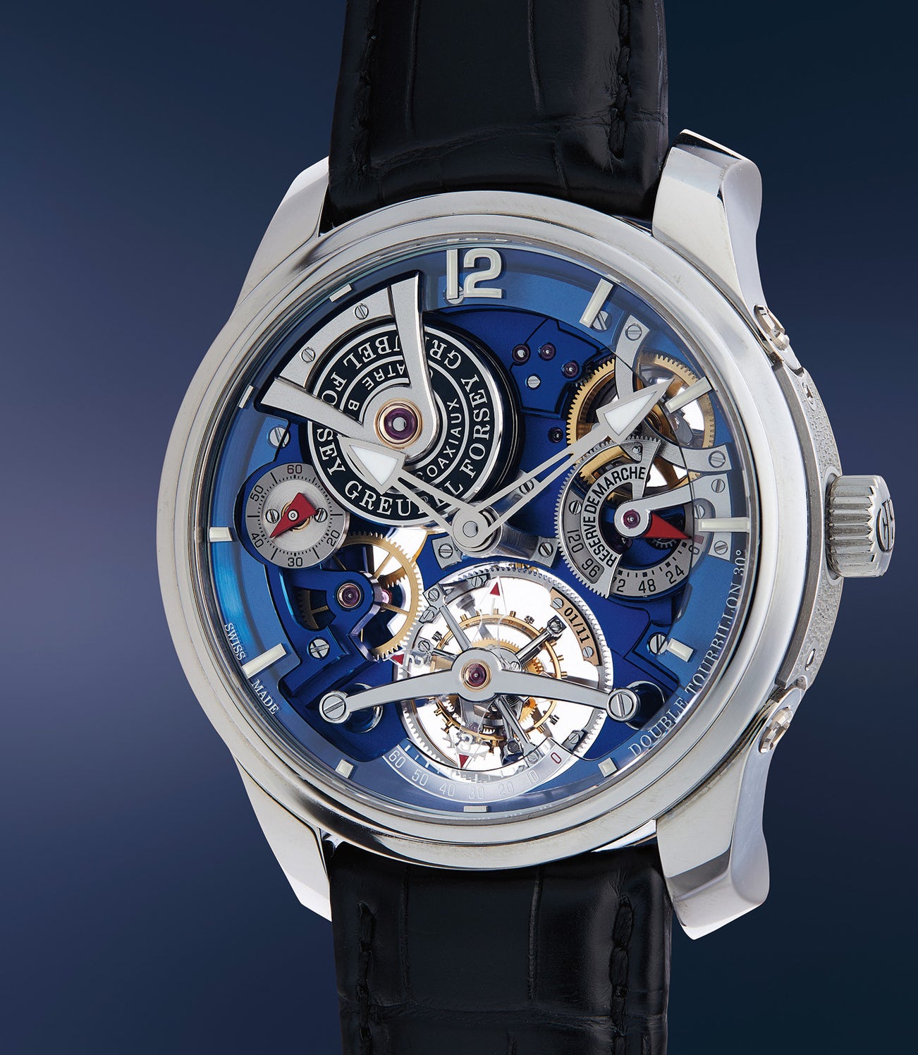 Swiss | 2004With the introduction of the Double Tourbillon 30 at Basel World in 2004, Robert Greubel and Stephen Forsey became major players in the world of haute horology and independent watchmaking. Their firm concentrates on high-end complicated movements with precision timekeeping and the highest quality hand finishing. They achieve this with movements featuring multiple tourbillons and inclined balance wheels — tourbillons designed for wristwatches. Forsey joined Greubel's team at Renaud & Papi SA, a high-complication specialist now part of Audemars Piguet. The team participated with Harry Winston and their Opus 6 project. In the span of 12 years, the firm has become highly sought-after by collectors for their innovative timekeeping and industrial design.