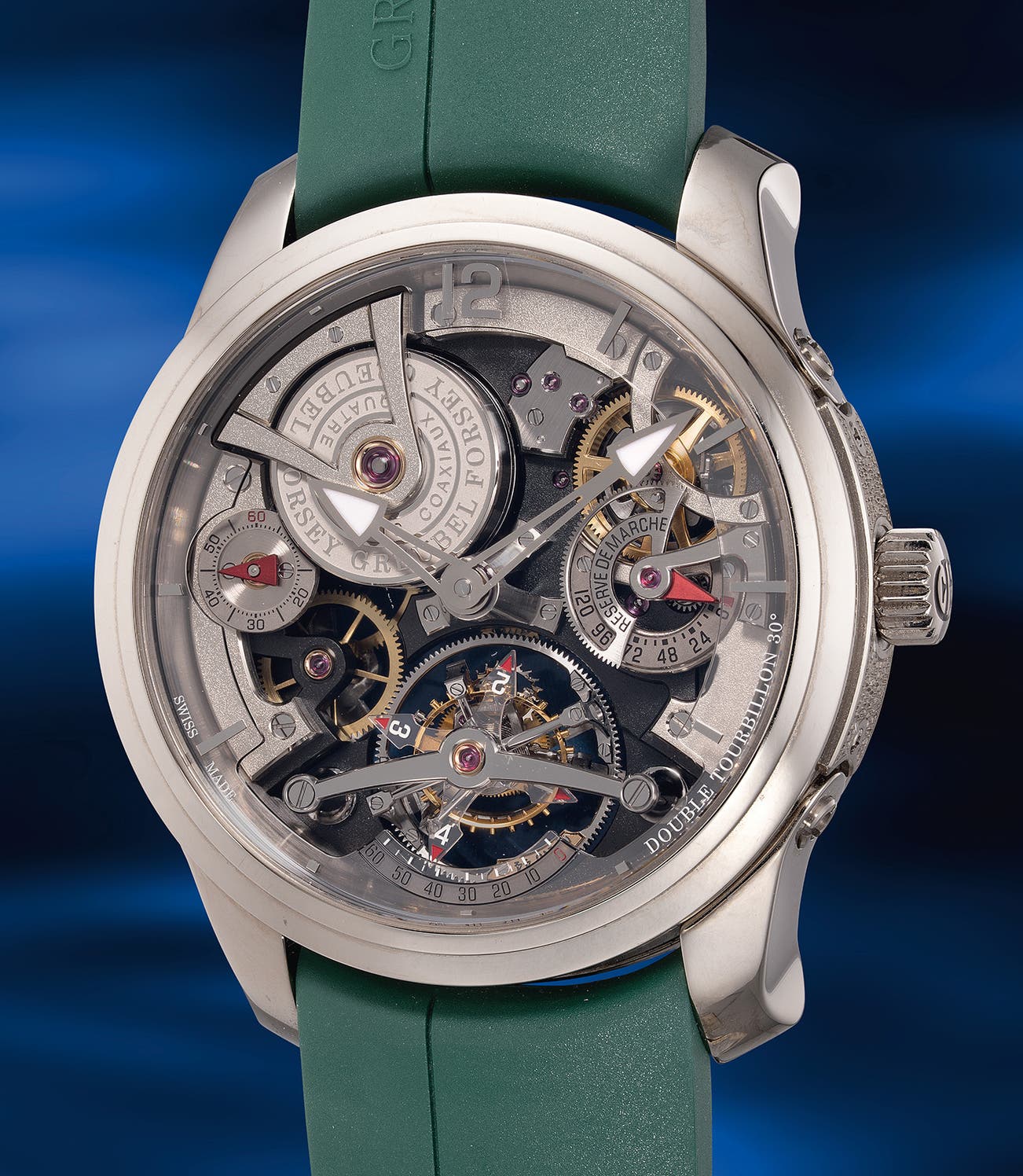 Swiss | 2004With the introduction of the Double Tourbillon 30 at Basel World in 2004, Robert Greubel and Stephen Forsey became major players in the world of haute horology and independent watchmaking. Their firm concentrates on high-end complicated movements with precision timekeeping and the highest quality hand finishing. They achieve this with movements featuring multiple tourbillons and inclined balance wheels — tourbillons designed for wristwatches. Forsey joined Greubel's team at Renaud & Papi SA, a high-complication specialist now part of Audemars Piguet. The team participated with Harry Winston and their Opus 6 project. In the span of 12 years, the firm has become highly sought-after by collectors for their innovative timekeeping and industrial design.