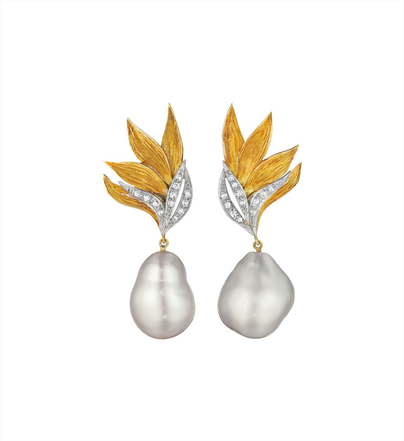 Each suspending a baroque cultured pearl, measuring approximately 17.50 mm, from a textured gold foliate surmount, enhanced by circular-cut diamonds, mounted in 18K yellow and white gold, length 1 1/2 inches.