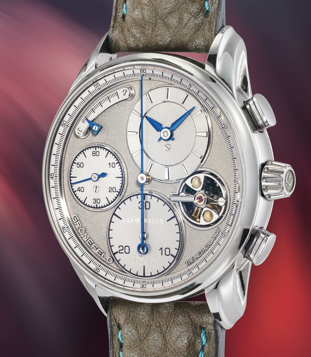 The Grönograaf was first introduced as a limited edition of 25 pieces in tantalum—like the present example—which quickly sold out, followed by a limited edition of 188 pieces in steel. Bearing the number 25/25, the present example represents the final tantalum model ever produced.