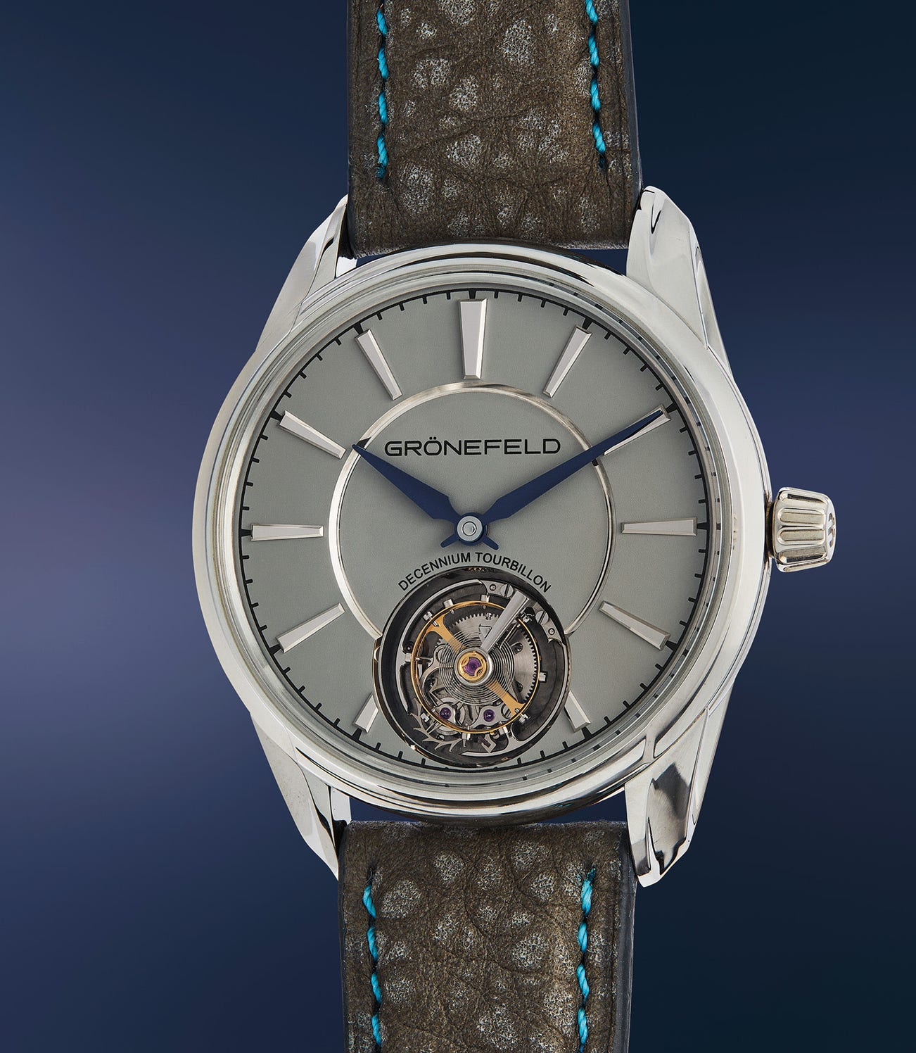 The creation of the Decennium Tourbillon in 2019 celebrated the tenth anniversary of the brand’s formation, and the official partnership of the brothers Grönefeld. It combines the well-known, sleek yet dynamic case of the 1941 with an automatic flying tourbillon, seen through the aperture in the dial. The dial itself is a chameleon, officially billed as lacquered matte grey but certainly bordering on a soapstone blue in some lighting conditions. The center section of the dial is slightly recessed, allowing the outer portion with the polished hour indexes and the open tourbillon cage to operate on different depths. No running seconds hand means the watch is optimized for simplicity and readability, with the tourbillon as the star.