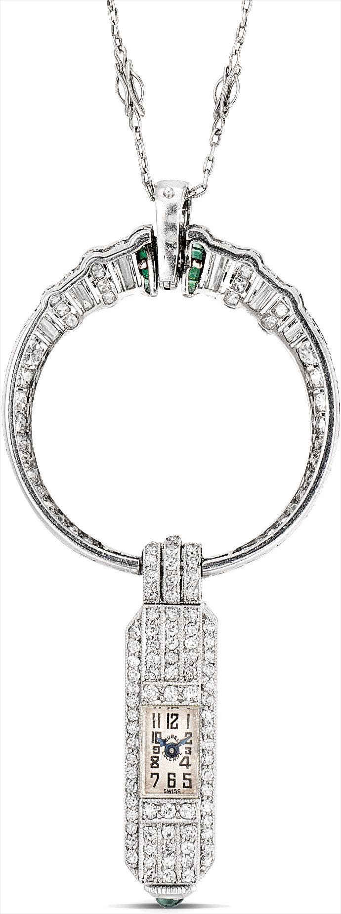 A fine, large and incredibly rare platinum, diamond and emerald-set necklace form watch