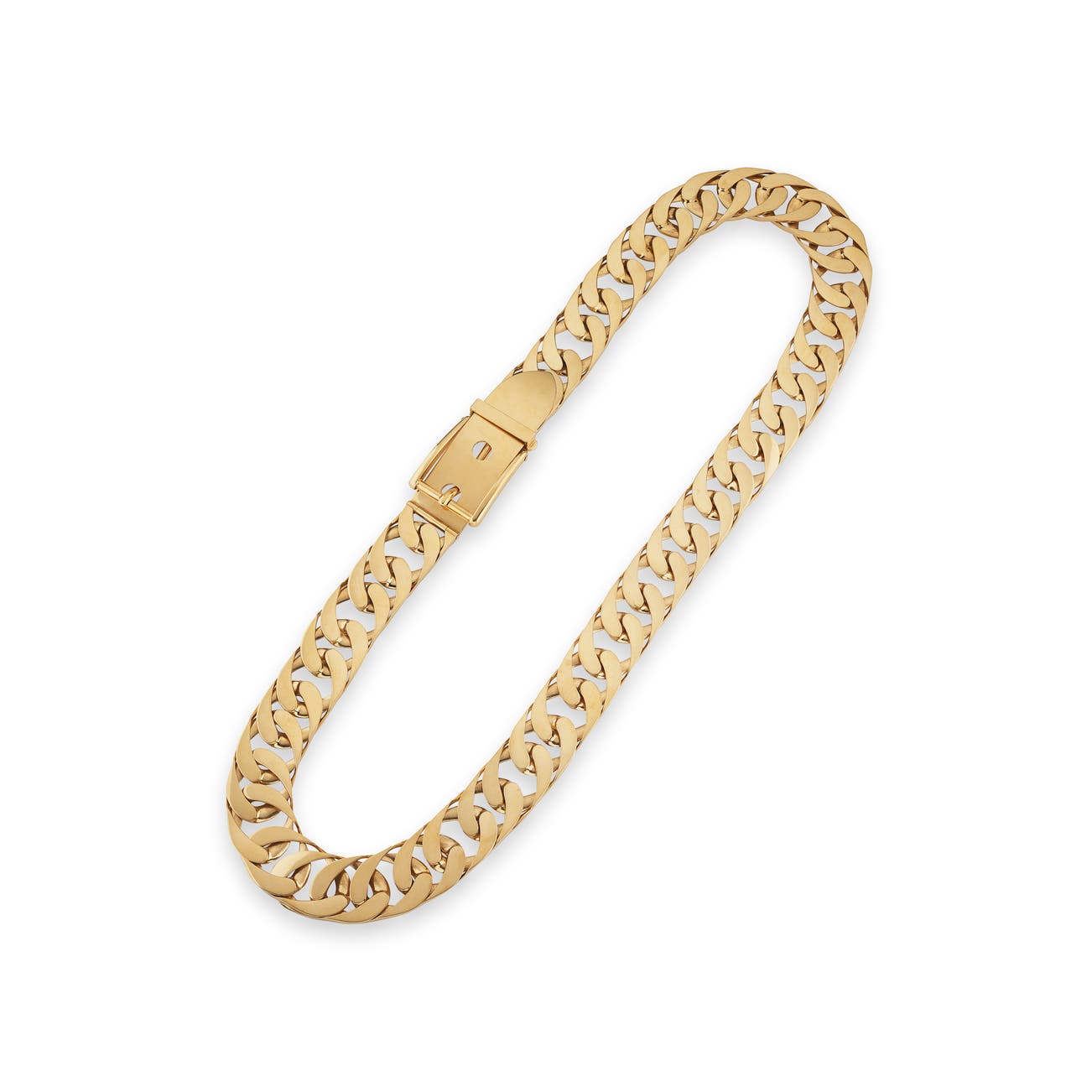 Composed of flat curb links, terminating to a buckle, longest length approximately 870mm, shortest length approximately 845mm, signed Gucci.