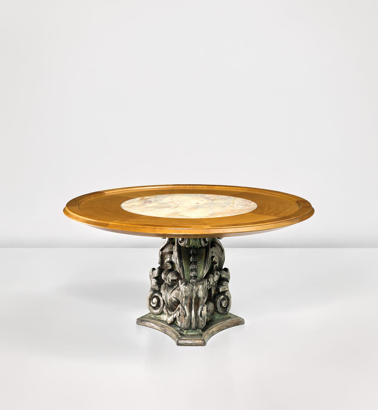 For the present table the architect and furniture designer Guglielmo Ulrich incorporated an eighteen-century pedestal base with wood and marble tabletop. The fanciful carved and painted base reflect's Ulrich's study of Venetian history during this period, while the tabletop's simplicity of form situates the design within the post-war period.