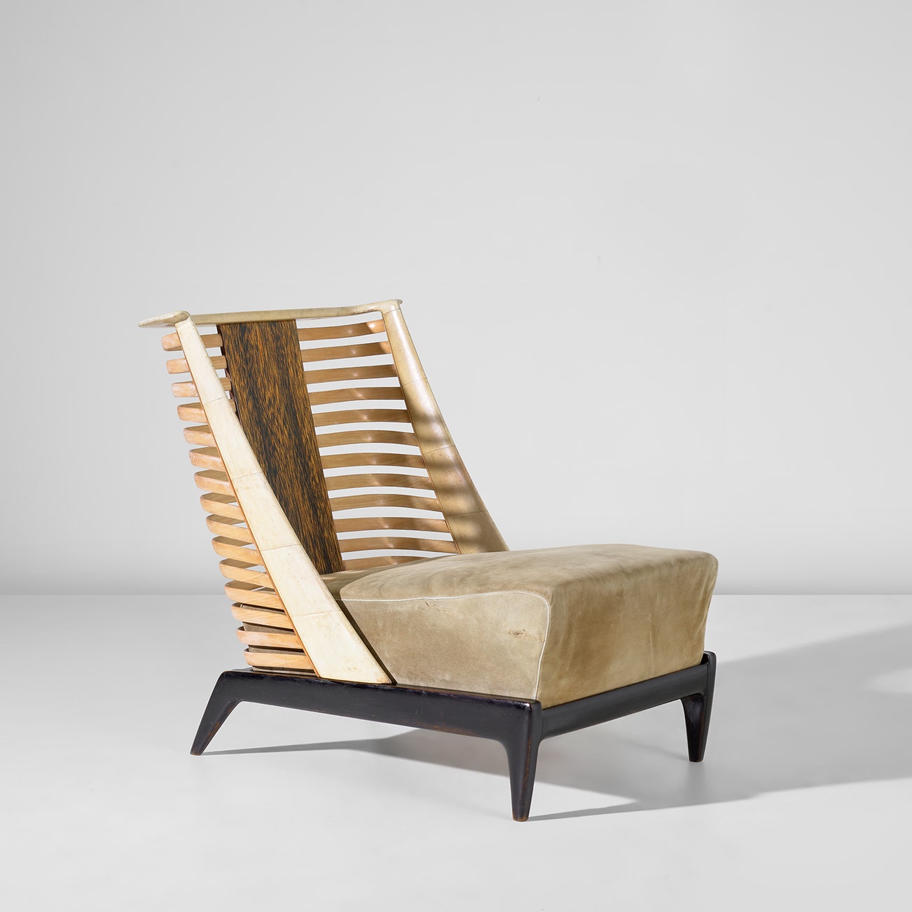 Stained East Indian rosewood, maple, parchment-covered wood, palm wood, suede.