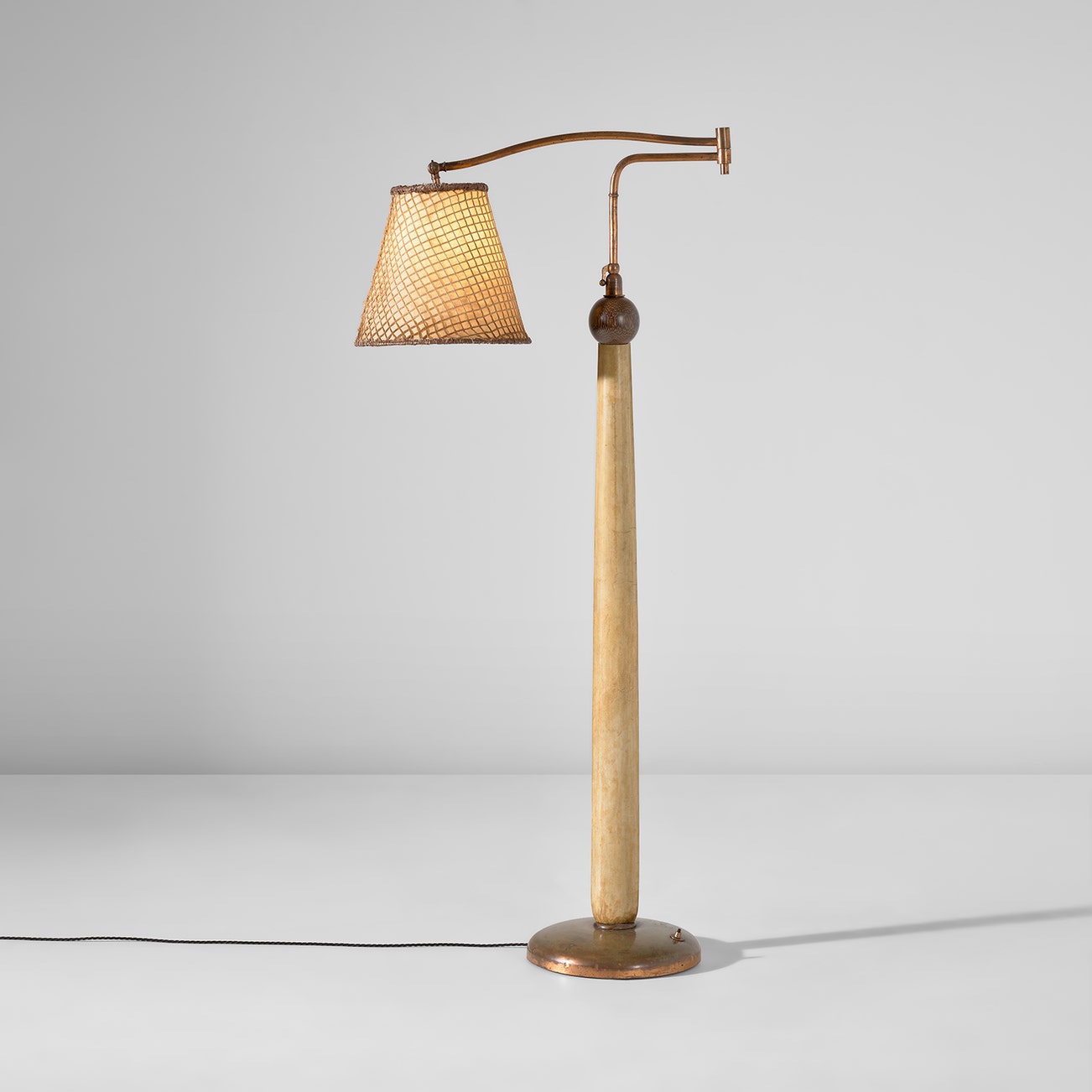 Parchment-covered wood, copper-plated brass, brass, palm wood, Macassar ebony, paper, leather, cotton thread, raffia.