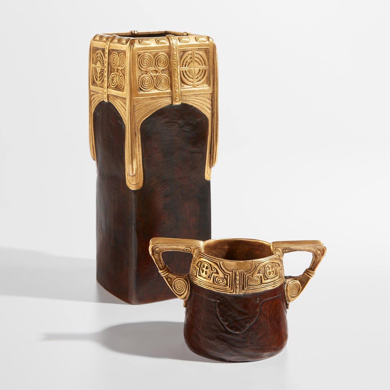 Cast by K.K. Kunsterzgiesserei, Vienna. Taller vase impressed GURSCHNER on one side and further impressed K.K./Kunst-Erzgiesserei/Wien/1488 on the underside. Shorter vase impressed GURSCHNER at base and further impressed KKKE Wien 1408 on the underside.