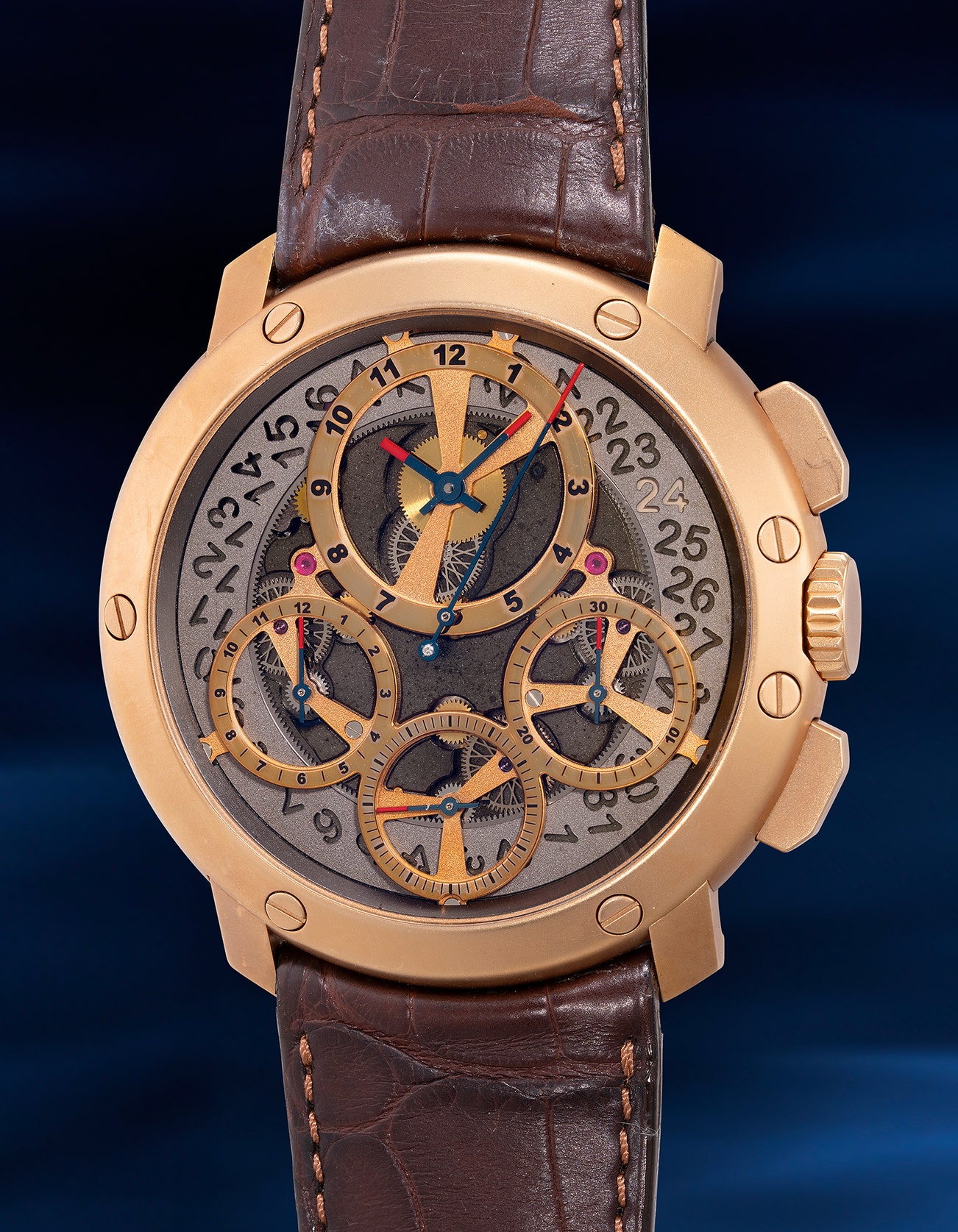 A fine and oversized pink gold semi-skeletonized chronograph wristwatch with small seconds and date