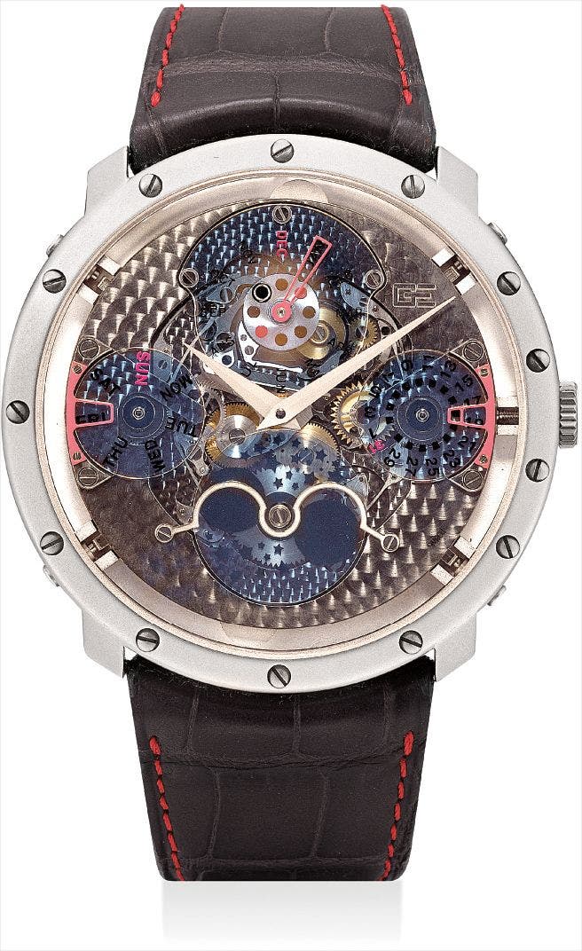 The present watch by Guy Ellia features a skeletonized dial, allowing the watch to reveal its inner beauty. The bottom plate is transformed as the dial and reinforced with black ruthenium treatment, making the watch so slim that it sits on the wearer’s wrist comfortably. The dial displays four sapphire crystal discs indicating the perpetual calendar, leap year indicator and moon phases. The watch is offered in like new condition.