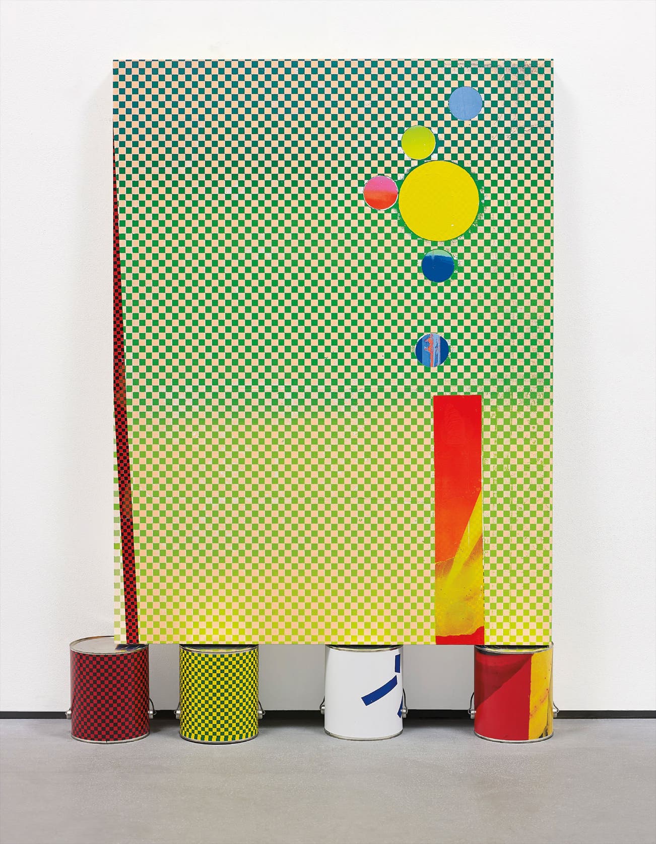 paint, silkscreen, inkjet print on canvas and digital inkjet prints on paint cans, in 5 parts