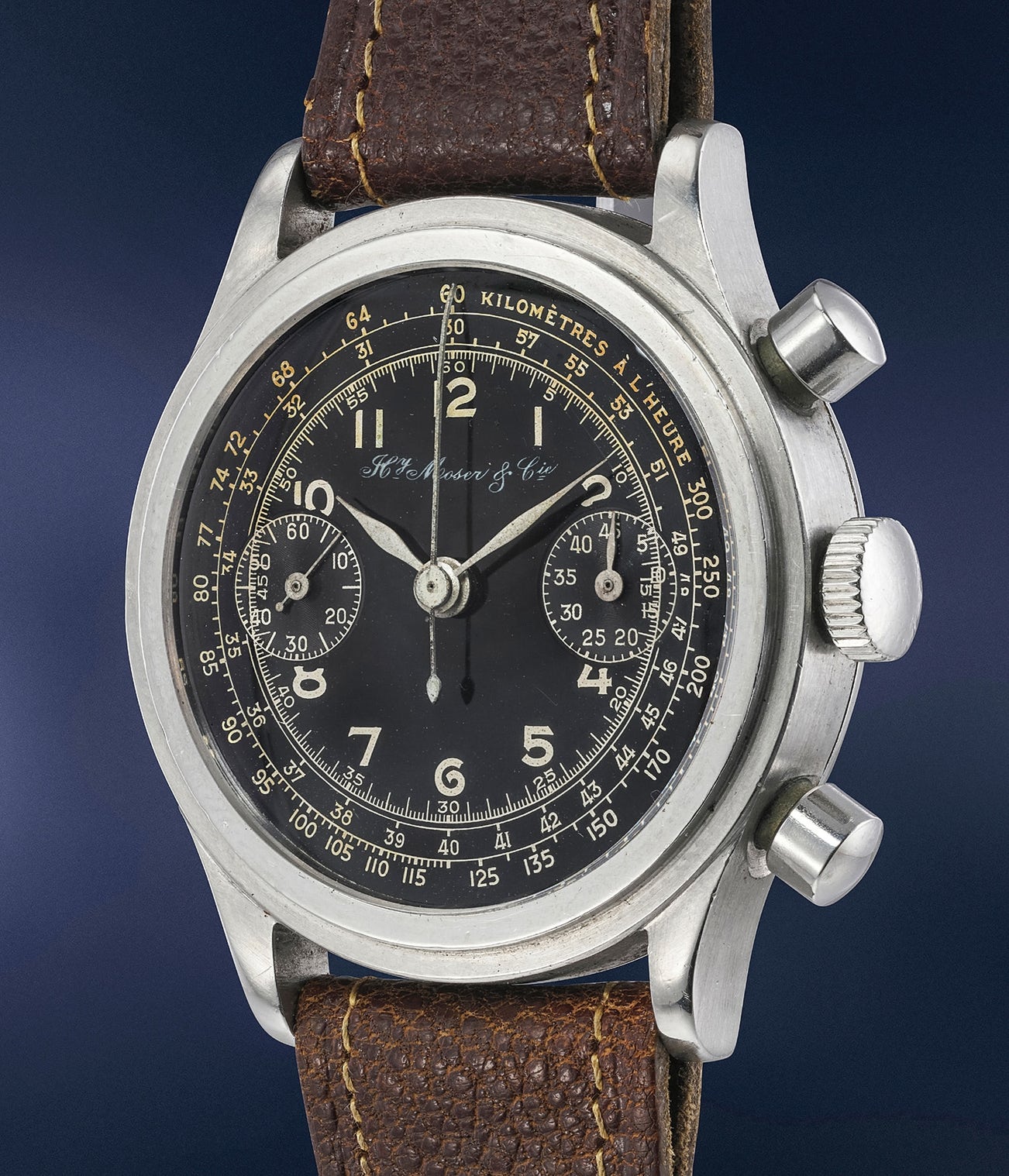 Displaying a generously sized 38mm case, the present chronograph by H. Moser & Cie is an incredibly well-preserved specimen. Boasting a stepped bezel and a beautiful lacquer dial, it exudes 1950s flair, and even has design similarities to the better known Longines "Tre Tacche" of the same period.