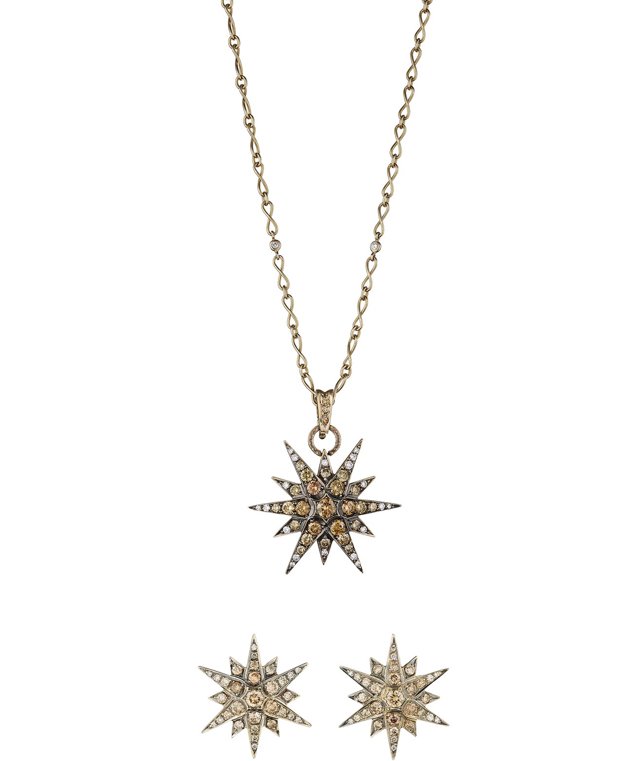 Comprising a pendant necklace and a pair of earrings, each set with brilliant-cut diamonds of brown tint, mounted in 18K gold, chain length measuring approximately 16-24 inches with 4 adjustable links. Necklace and earrings signed with maker's mark..