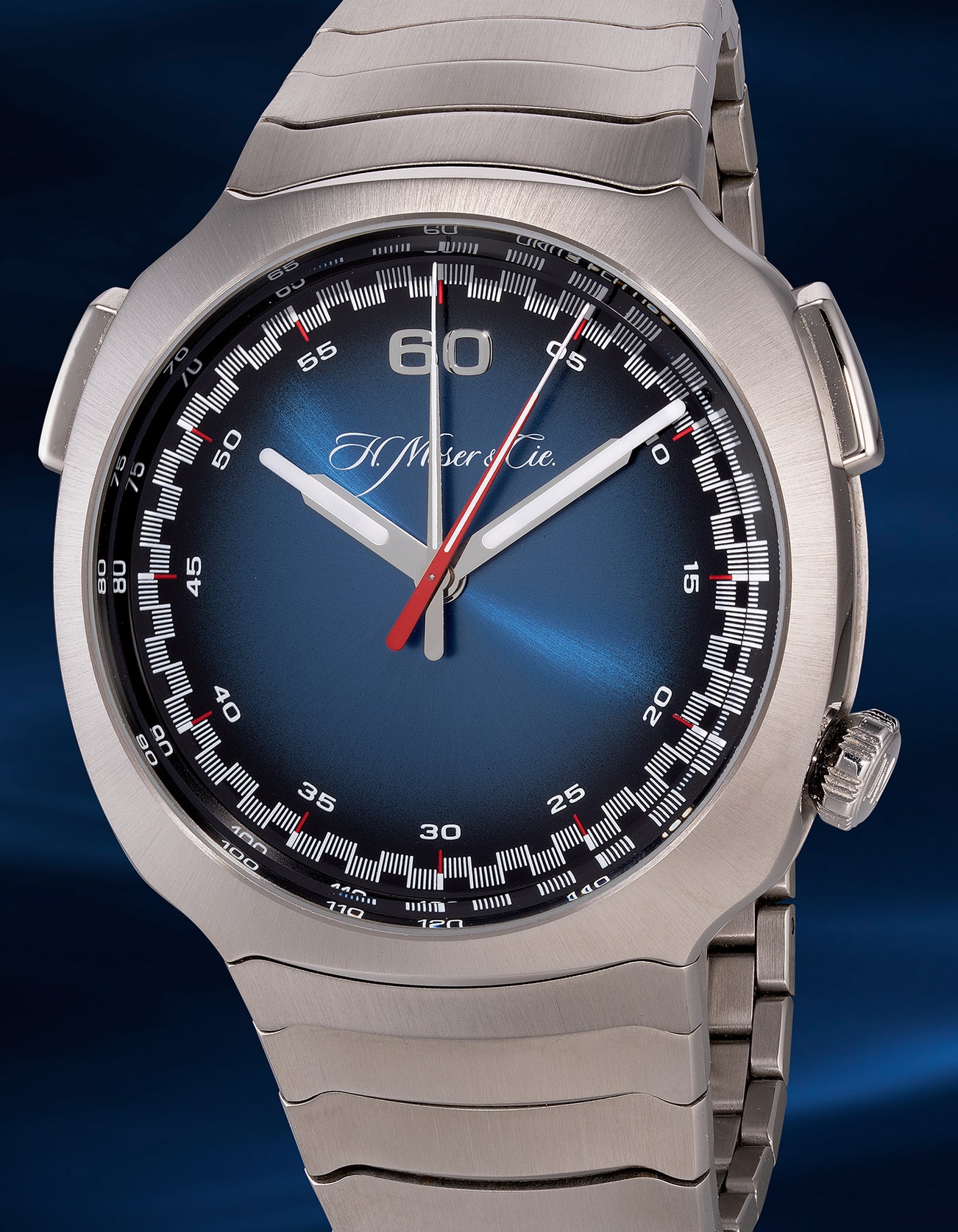 • Featuring a case with aerodynamic lines and a wave-like integrated bracelet to match, this model draws inspiration from the 1930s locomotives and has now become somewhat of a signature of the brand. Rather than corrupting the unobstructed blue fumé dial display, the subsidiary minutes are thoughtfully placed on the outer edge of the canvas, which is very much in line with the manufacturer's "less is more” philosophy. Upon activation, a white chronograph hand will travel around the dial, while a red counter hand moves along with each passing minute up to 60 minutes. This allows for a clean dial that is unimpeded by any subsidiary seconds.