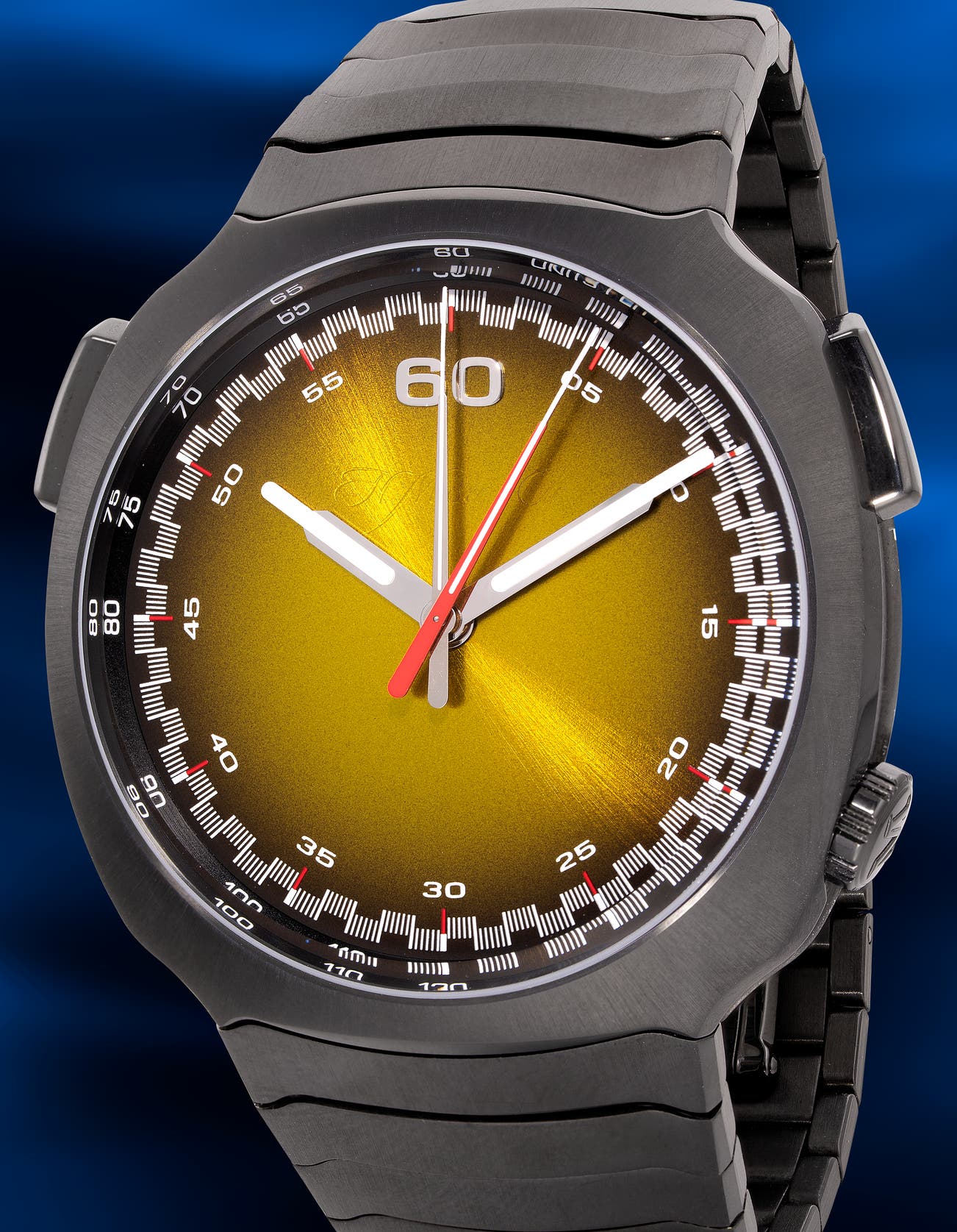 A “like-new”, very rare and attractive limited edition DLC-coated stainless steel flyback chronograph wristwatch with yellow fumé dial, integrated bracelet, guarantee and presentation box, one of a limited edition of 20 pieces made for Alpine F1 Team