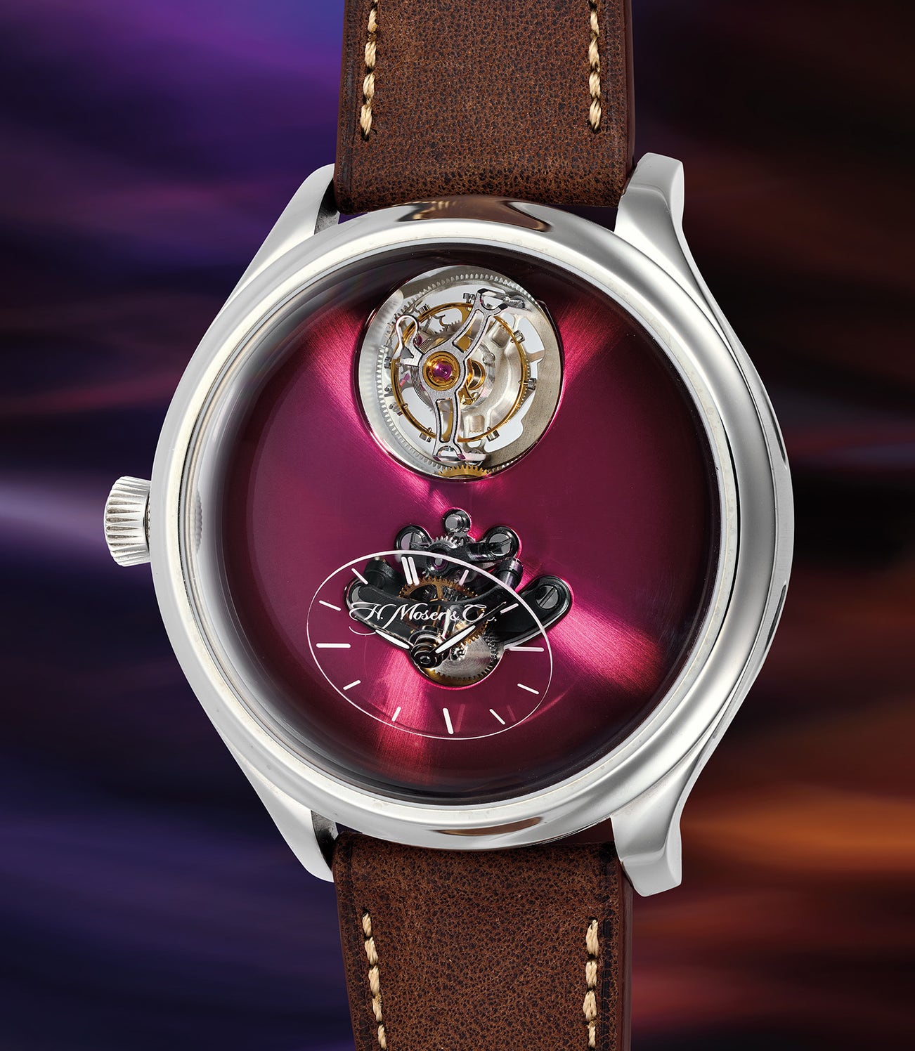 One of the results of this amalgamation of funky watchmaking was the Endeavor Cylindrical Tourbillon. Only 75 pieces were made in stainless steel, in 5 fumé dial colors with 15 examples each – funky blue, cosmic green, off-white, ice blue, and like the present example, burgundy. The dial treatment , exposed cylindrical tourbillon, and movement are decisively Moser, while the MB&F identity comes through in the design of the dial elements and the domed crystal. Time is told via a tilted sapphire crystal affixed to the lower portion of the movement.