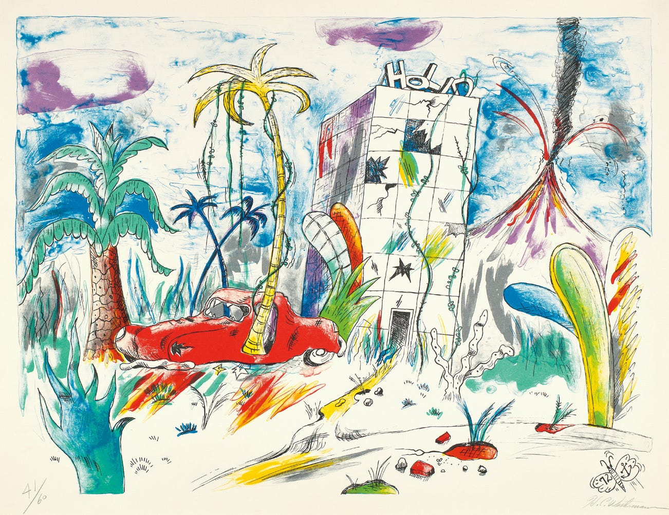 Lithograph in colors, on Rives BFK paper, with full margins.